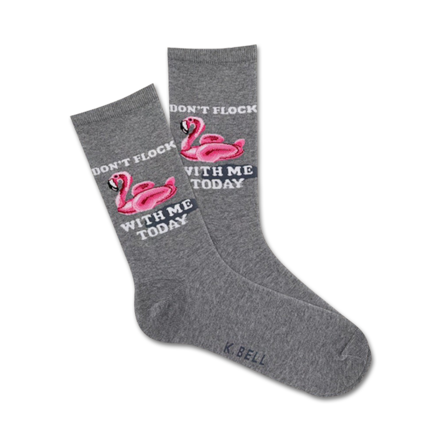 Say Don't Flock With Me Today in style with these fun, lighthearted crew socks for women! Picture this: a majestic flamingo wearing shades, chilling on a pink inner tube ”all while floating across your feet. Perfect for a dash of flamingo flair on your feet or a sassy statement on a lazy day. Treat your toes to these toe-tally hip socks, and strut your flockin' fabulous self!