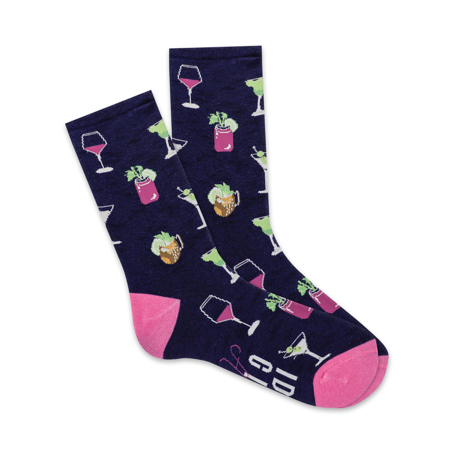 Sip into style with these spirited blue Don't Give a Sip socks! Featuring a playful pattern of wine glasses, martini glasses, cocktail glasses, lime wedges, and mint sprigs, they're the perfect accessory for any happy hour. The bold pink lettering on the top of the sock declares your stance on sipping, "I Don't Give a Sip." Slip on a pair of these crew-length socks and raise a glass to fun and fashion, with a slice of sass!