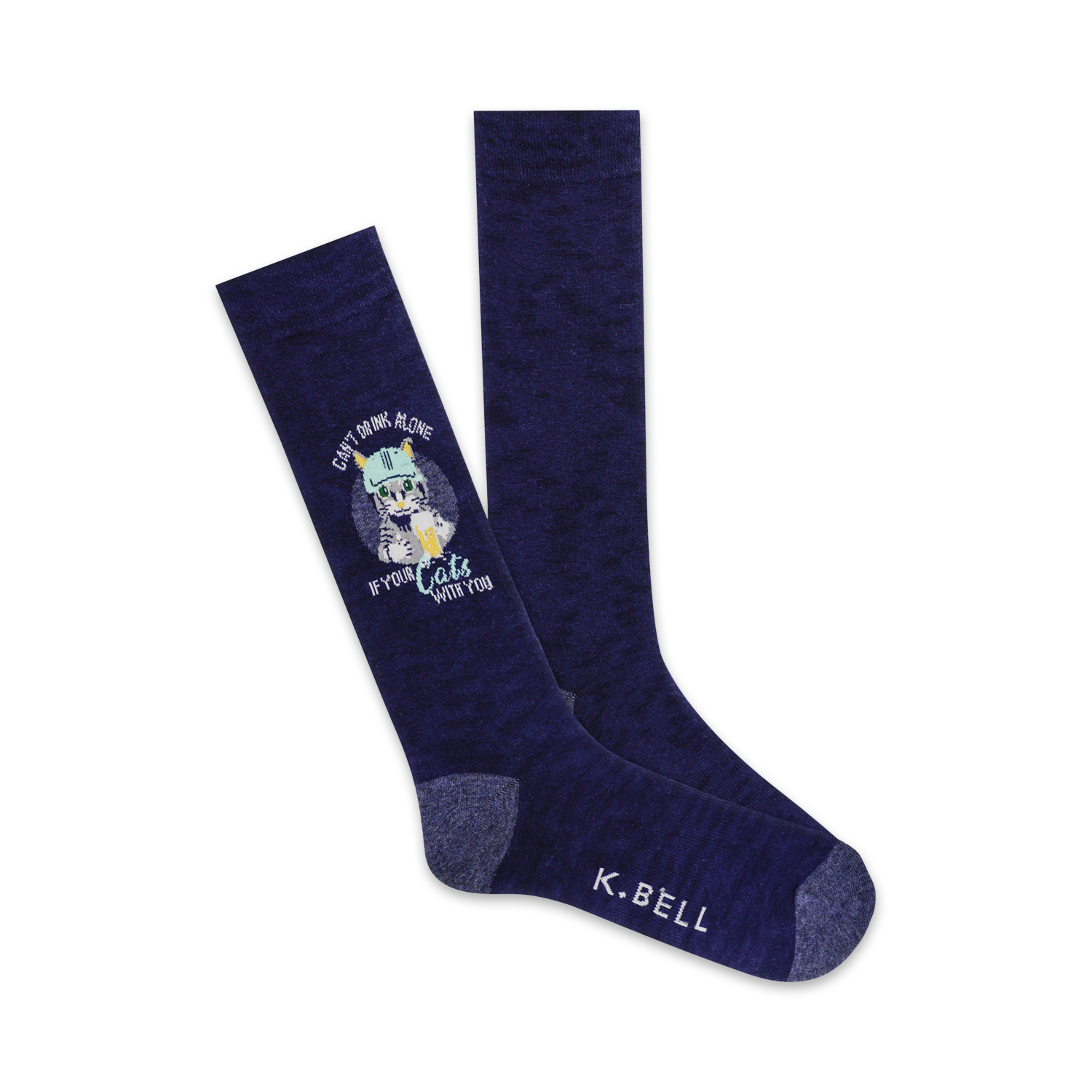 Raise a glass to your favorite drinking buddies while wearing these funny and boozy cat-themed socks! Featuring a picture of a cat wearing a hat and drinking from a glass, and the text "Can't drink alone if your cat's with you," these crew socks are sure to get a laugh from your friends. Who needs a designated driver when you've got your cat with you? They may not be able to hold your hair after a night of fun, but they'll never judge you for wanting that extra glass of wine.
