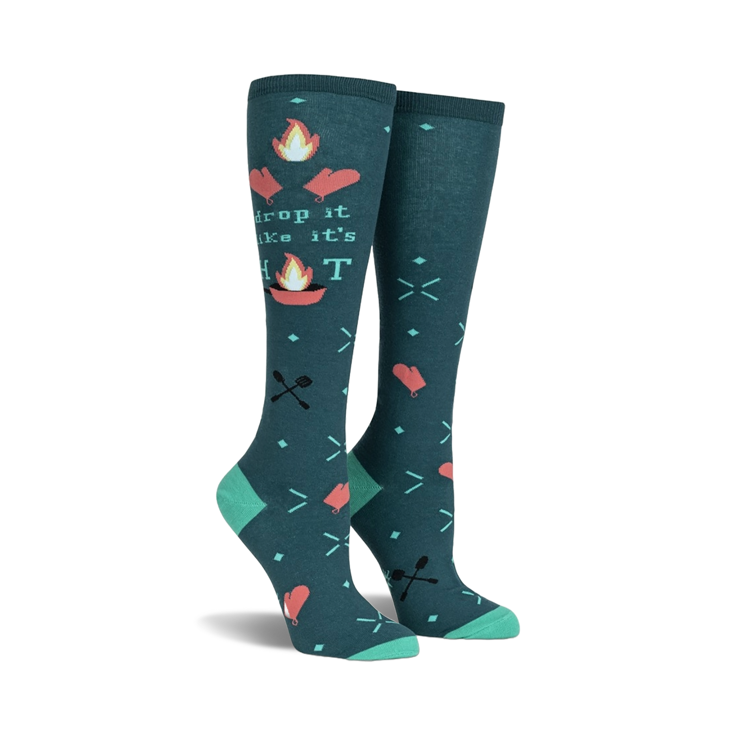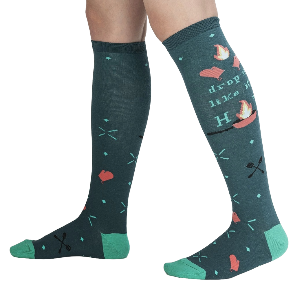 Calling all kitchen queens and cooking fanatics! Say goodbye to boring socks and add some flavor to your feet with our "Drop It Like It's Hot" socks. Picture this: a dark teal canvas covered in a sizzling hot pattern of flames, hearts, spatulas, and the iconic phrase "Drop It Like It's Hot" in bold letters. These knee-high socks aren't just for show they're made with stretchy, durable material that'll keep up with your every culinary move. Get ready to stir up some fun in the kitchen and show off your love for cooking in style. Trust us, these socks are the perfect recipe for a good time!