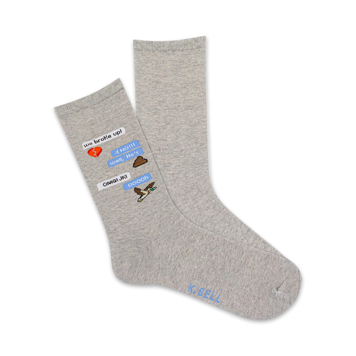 Breakup text socks for Women: Keep your feet cozy and stylish with our amusing gray crew socks featuring a hilarious breakup text message exchange and emotional emojis ”a reminder that even the messiest breakups can have an "OMG JK" moment.