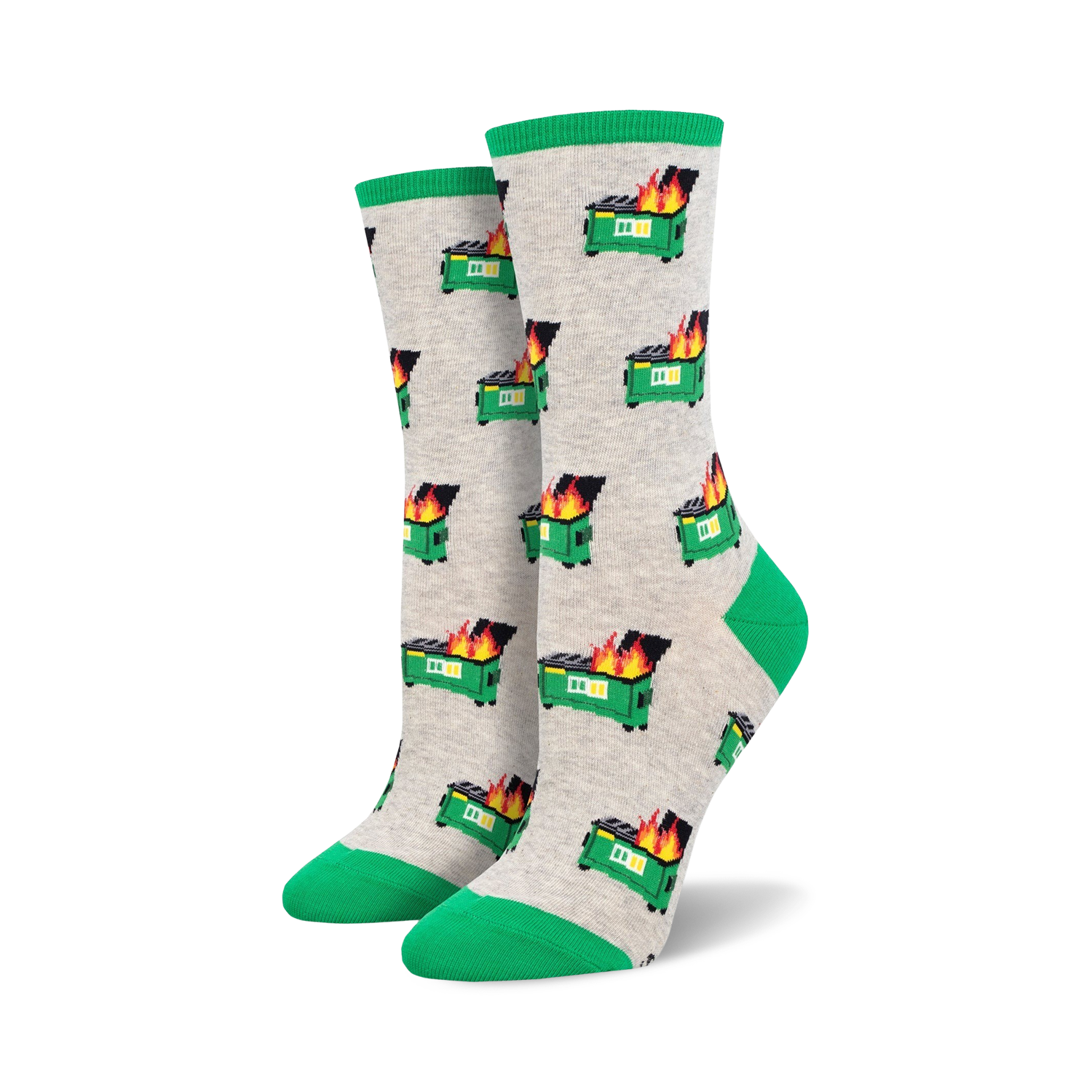 Dumpster Fire socks: When life throws you trash, put on these crew socks. Featuring a vibrant pattern of green dumpster fires with yellow and orange flames on a gray background, these socks will remind you that even amidst the chaos, you can keep your cool and stay fire. The green toes and heels add a touch of whimsy. Slip them on and let the dumpster fire burn bright!