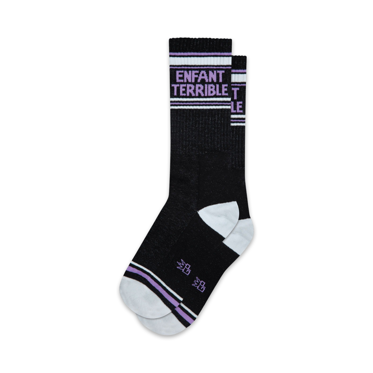 Laugh in the face of fashion norms with these Enfant Terrible socks, featuring the words "enfant" on the left sock and "terrible" on the right. These crew-length socks, perfect for both men and women, are bold, funny, and just a little bit rebellious. Wear them with your favorite sneakers or dress shoes and prepare for a barrage of compliments and curious glances. Whether you're a rockstar, a nonconformist, or just someone who loves to have fun with their wardrobe, these socks are sure to become your new go-to's.