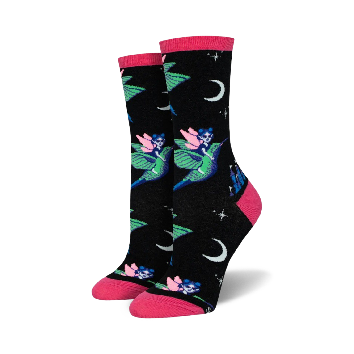 Discover the whimsical world of Fairytale Castle socks! Fairies dance under moonlight with hummingbirds, creating a unique, captivating design. These socks are a playful reminder to embrace magic and enchantment, transforming any outfit into an adventure.