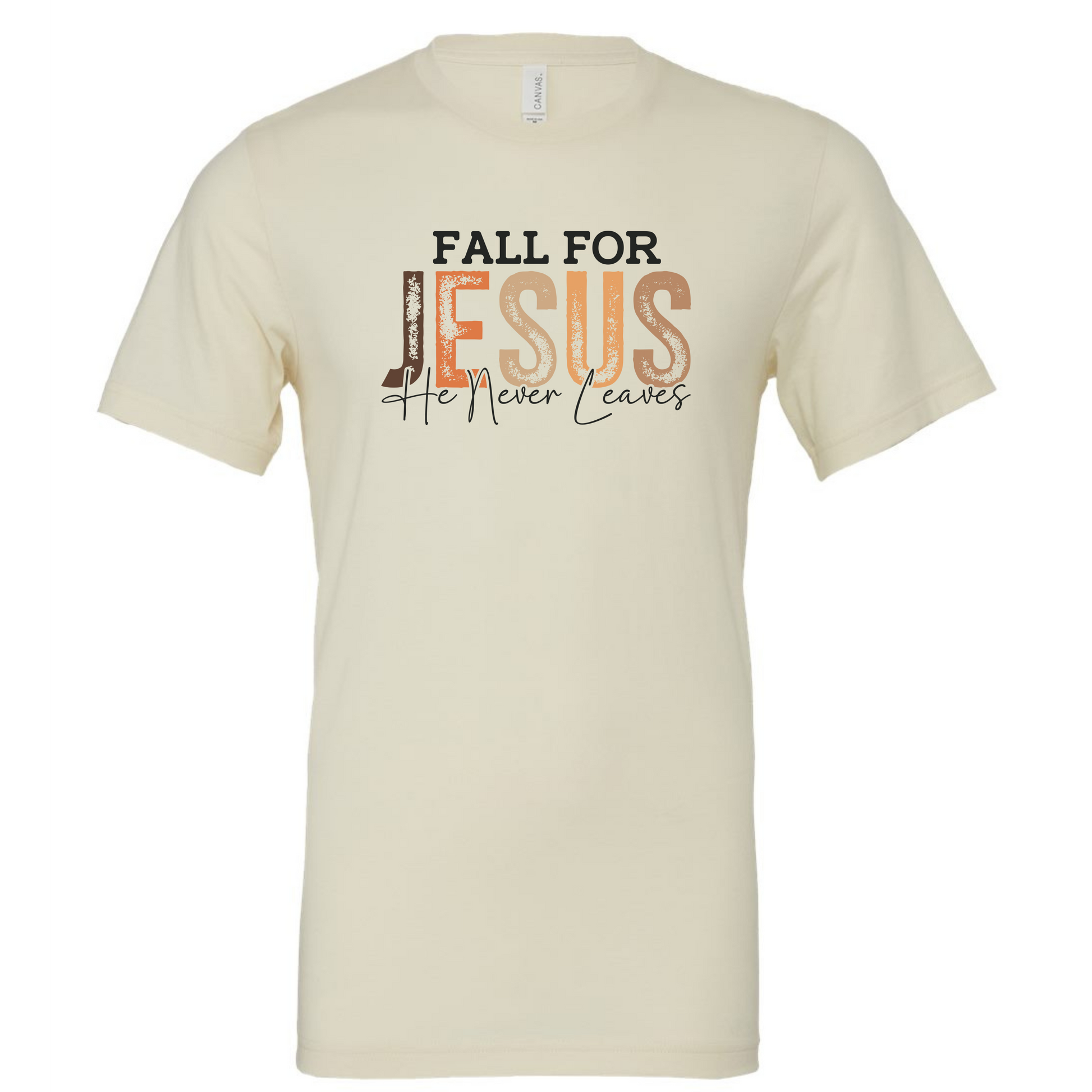Share your faith in style with this inspirational “Fall for Jesus, He Never Leaves” graphic tee. Designed in warm autumn tones with a rustic, distressed text finish, this shirt beautifully combines seasonal charm with a timeless message of hope and devotion.