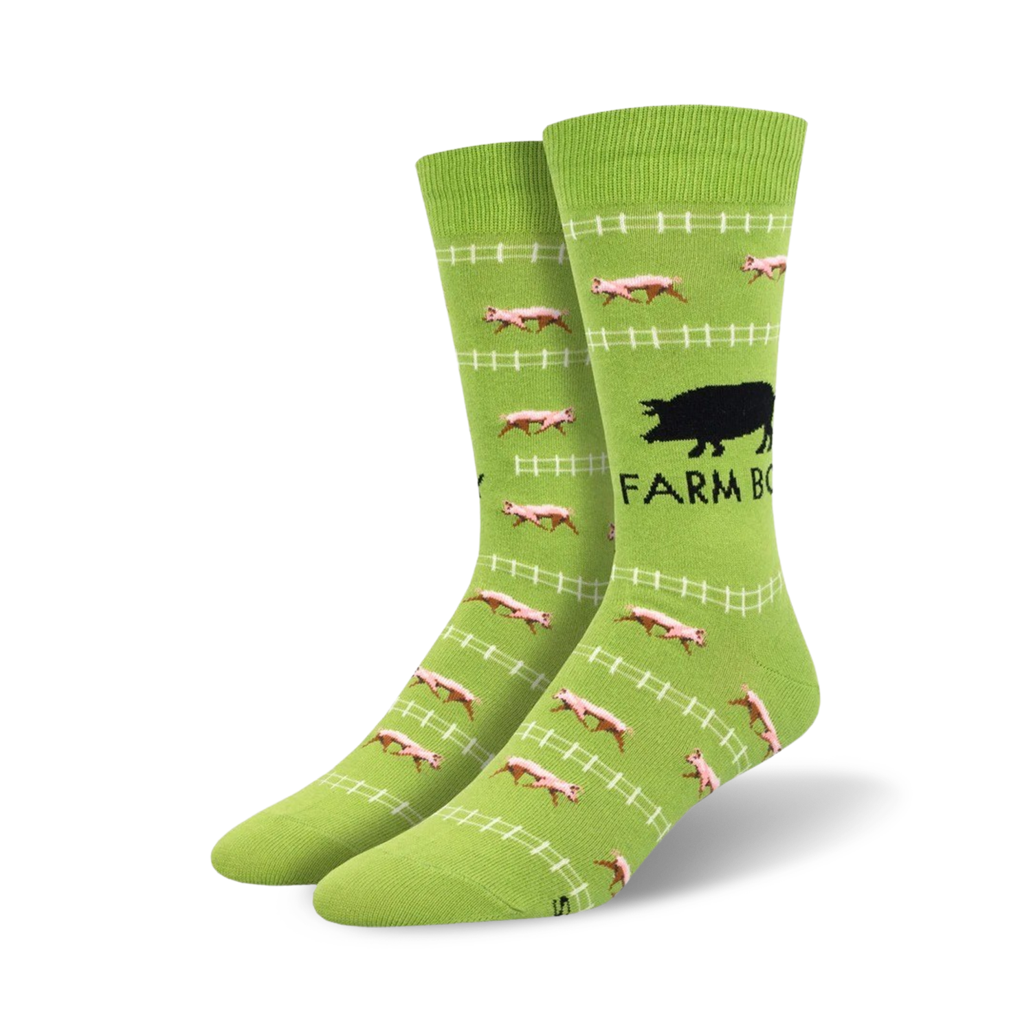 Get ready to root for the oink-tastic Farm Boy Crew Socks! These green socks sport a lively pattern of pink pigs in black collars, led by a distinguished pig sporting a sophisticated black hat. Whether you're a farm-loving city slicker or a down-home country boy, these socks will have you squealing with delight. Show off your adoration for all things farm with these charming socks that are sure to bring a smile to your face and those around you. They also make a great gift for any pig enthusiast.