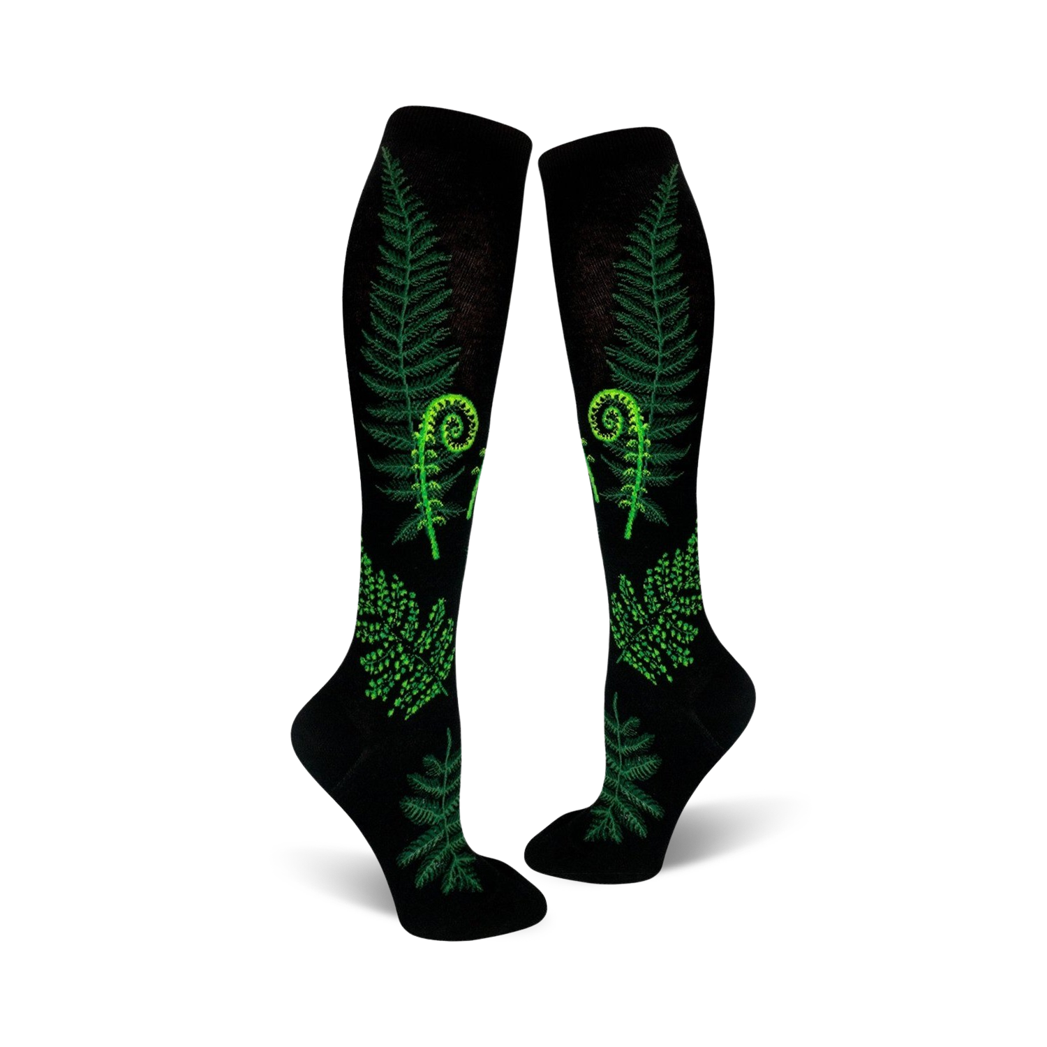 Ferns & Fiddleheads knee-high socks for women are totally groovy! Each sock features a whimsical pattern of green ferns and fiddleheads dancing up the leg. You'll feel like you're walking in the forest, even if you're just commuting to work. Show off your love of nature with these fun and funky socks!