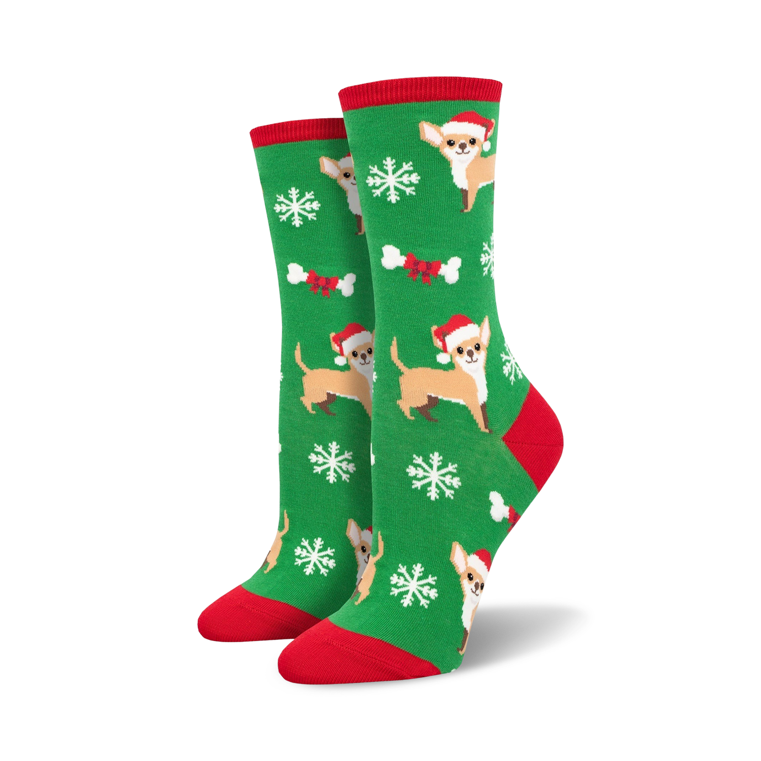 With these Festive Chihuahua socks, you'll be sleighing all day! Their jolly green color with cartoon Chihuahuas wearing Santa hats, snowflakes, and bones will make you the life of the paw-ty. Feel free to paw-mp up your holiday cheer with these crew-length socks meant for women who want to spread Chihuahua joy this Christmas!