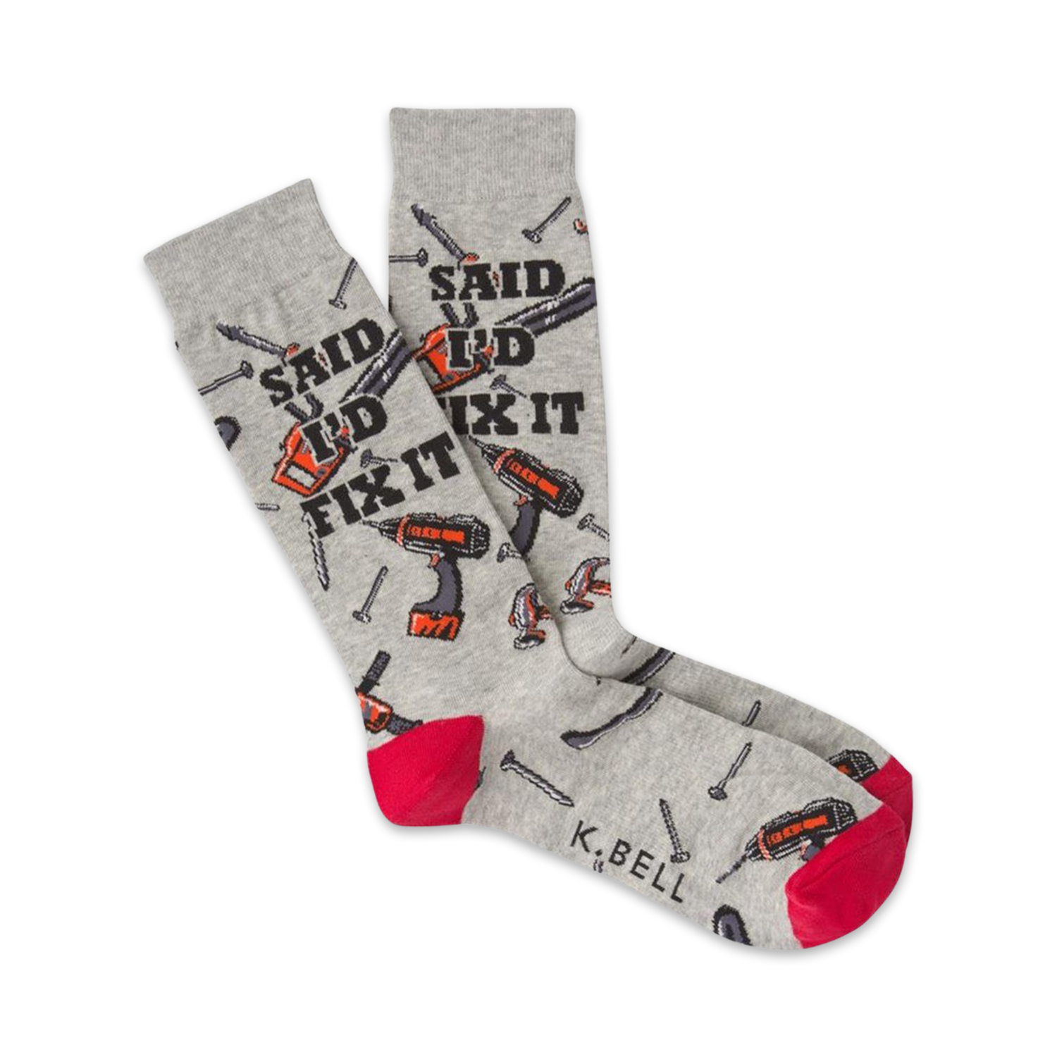 Say goodbye to boring socks and hello to Fix It, the most entertaining crew socks on the market. They're gray with a contrasting red toe and heel and are adorned with a hilarious pattern of tools and nails, along with the words "SAID I'D FIX IT" boldly displayed on the front. Whether you're a DIY enthusiast, a handyman, or just someone who loves a good laugh, these socks will bring a smile to your face and put a spring in your step. Grab a pair and become a walking, talking punchline!