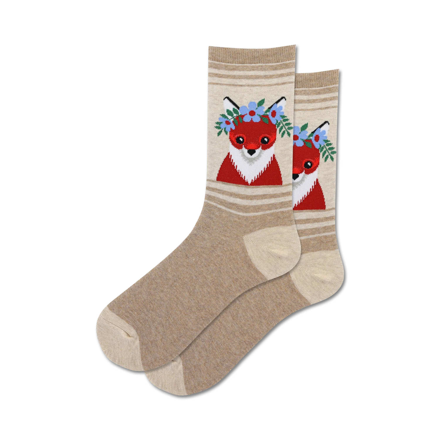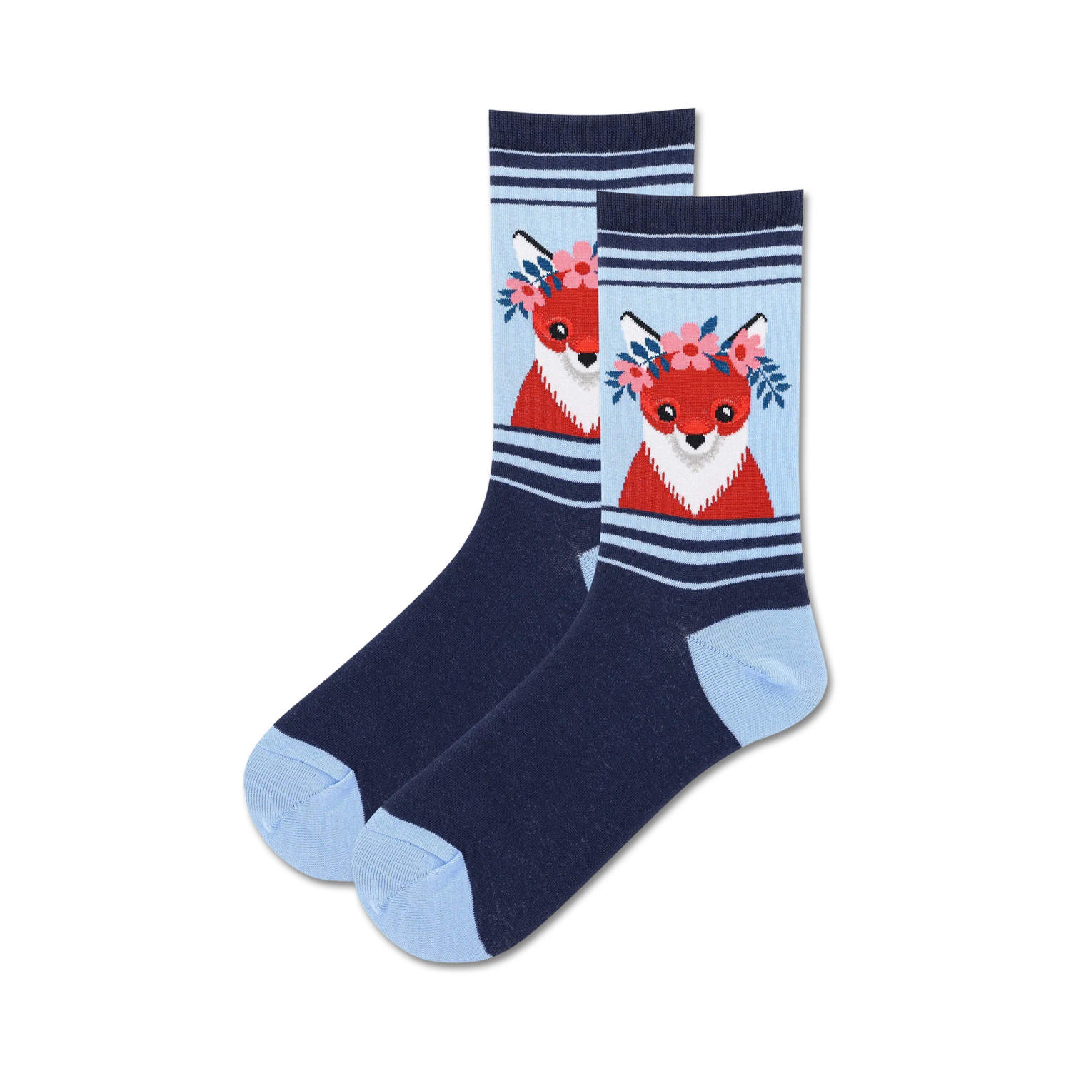 Meet Flower Crown Fox, the wildest and funkiest socks you never knew you needed! These dark blue socks feature a whimsical pattern of red foxes donning vibrant flower crowns. With white belly patches, paws, and tail tips, these foxes look ready to party! Blue toes and heels with eye-catching white and red stripes make these socks pop. Step into a pair and unleash your wild side!