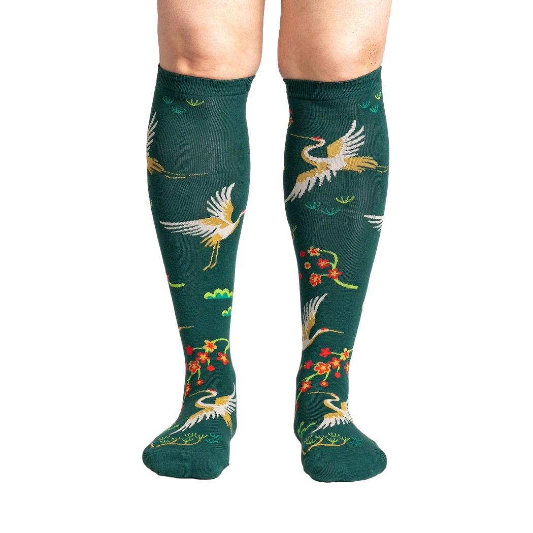 Embrace the beauty of the Orient with our Flying Cranes knee-high socks. Their dark green backdrop blooms with red and orange flowers, while elegant white and yellow cranes take flight. These socks are the perfect attire for bird watchers, nature lovers, and fans of Asian culture. Wear them with pride and soar above the ordinary!