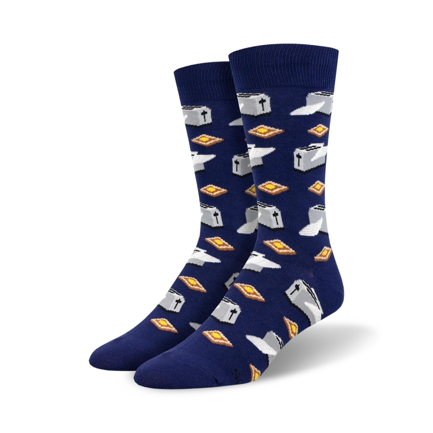 Prepare to be toasted by our "Flying Toaster" socks! Featuring a vibrant blue backdrop sprinkled with slices of buttered toast and soaring toasters, these socks will have you "wheeling" with laughter. Perfect for the breakfast enthusiast or anyone who appreciates a touch of whimsy, these crew-length socks for men are sure to be a "toast" of the town. Get ready to "flip" for our "Flying Toaster" socks today!