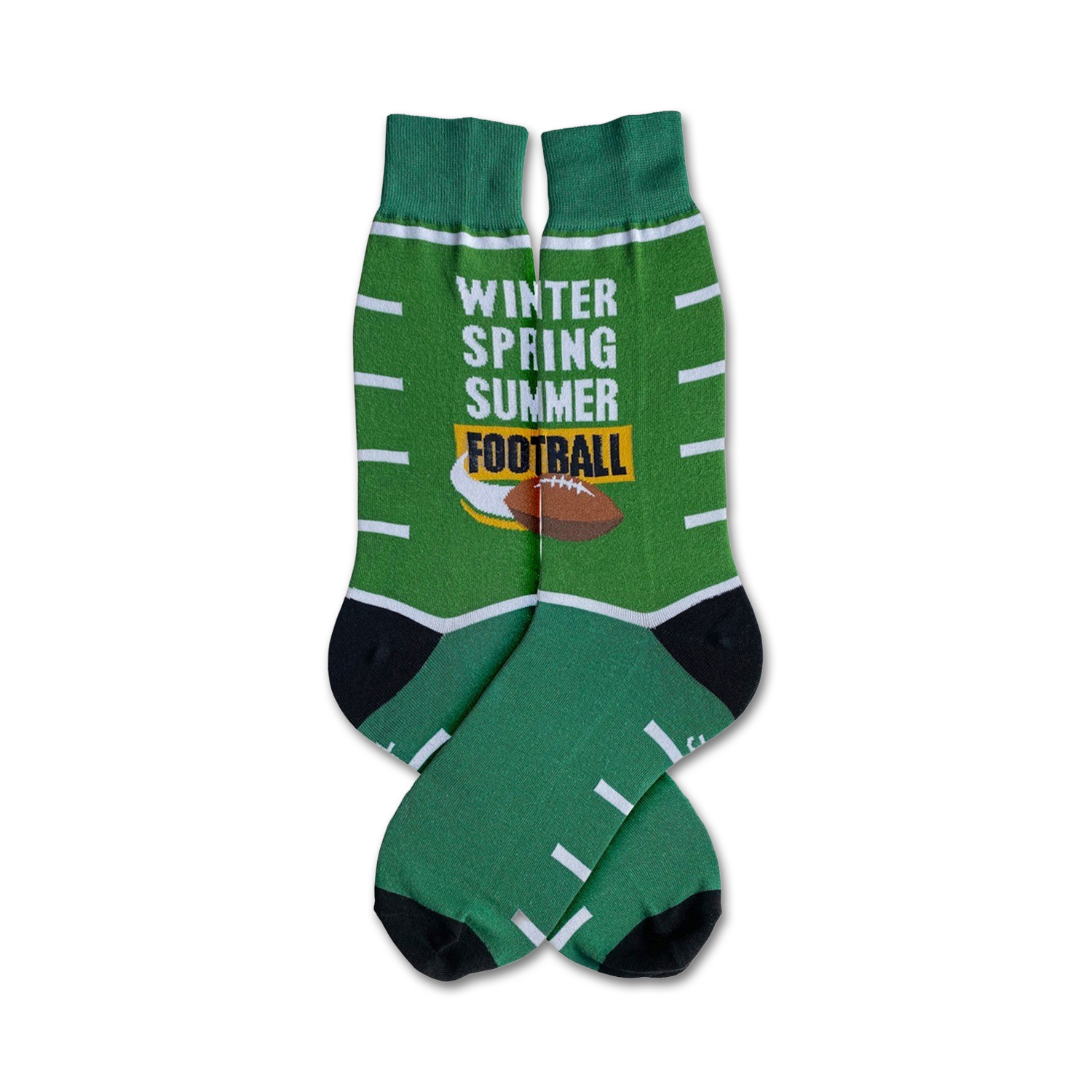 Football Season socks! These gridiron-green socks with black and white stripes and a black toe will keep you covered all season long. Whether you're a player, coach, or fan, these socks will keep your feet comfortable and stylish. We've even included the words "winter," "spring," and "summer" on them so you can wear them all year round. Touchdown!
