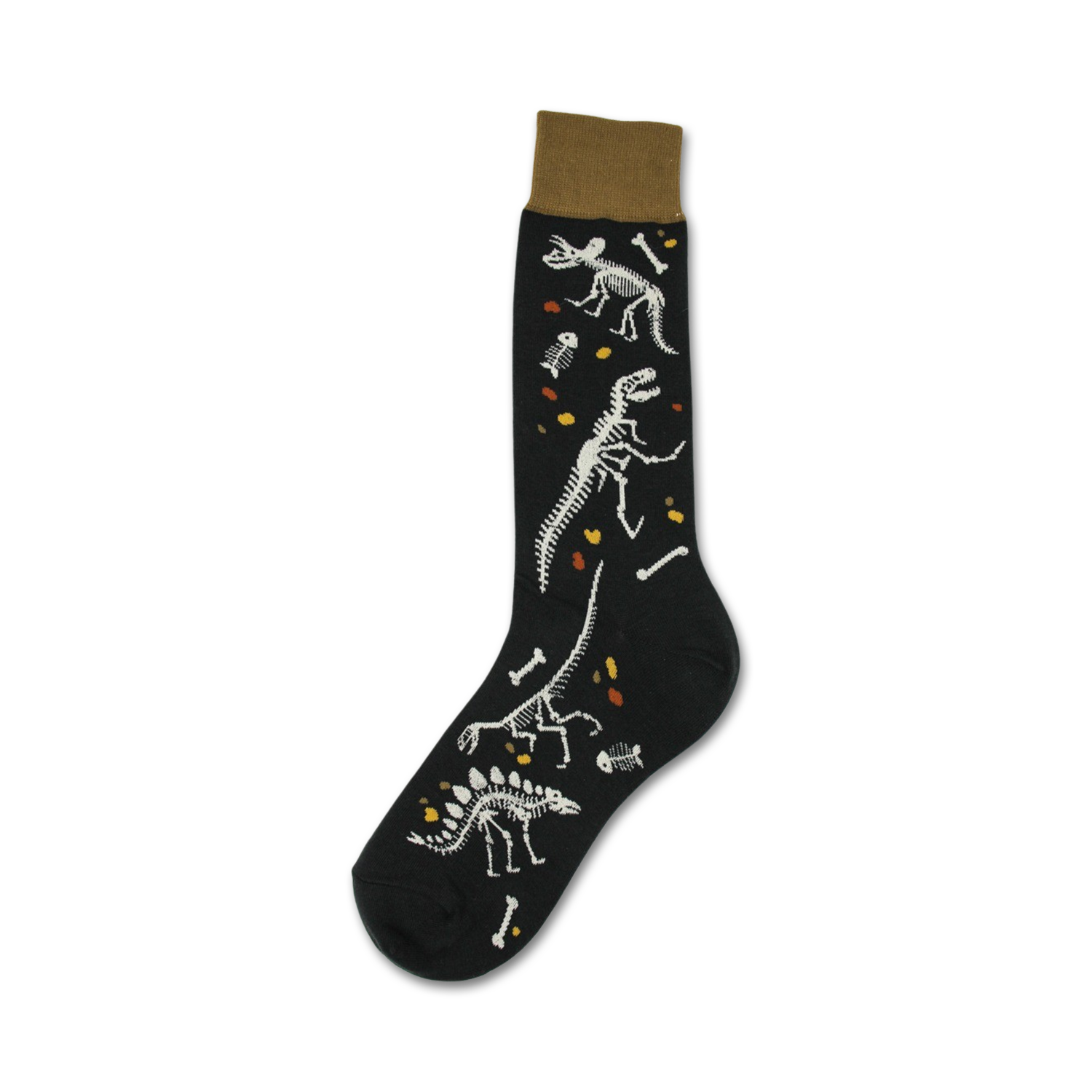 The past is back, and on your feet! Rock these Fossils crew socks for men featuring a T-rex and triceratops pattern. Prepare for a prehistoric moment every time you look down at your feet! Like any good fossil, these socks are built to last and sure to make you stand out.
