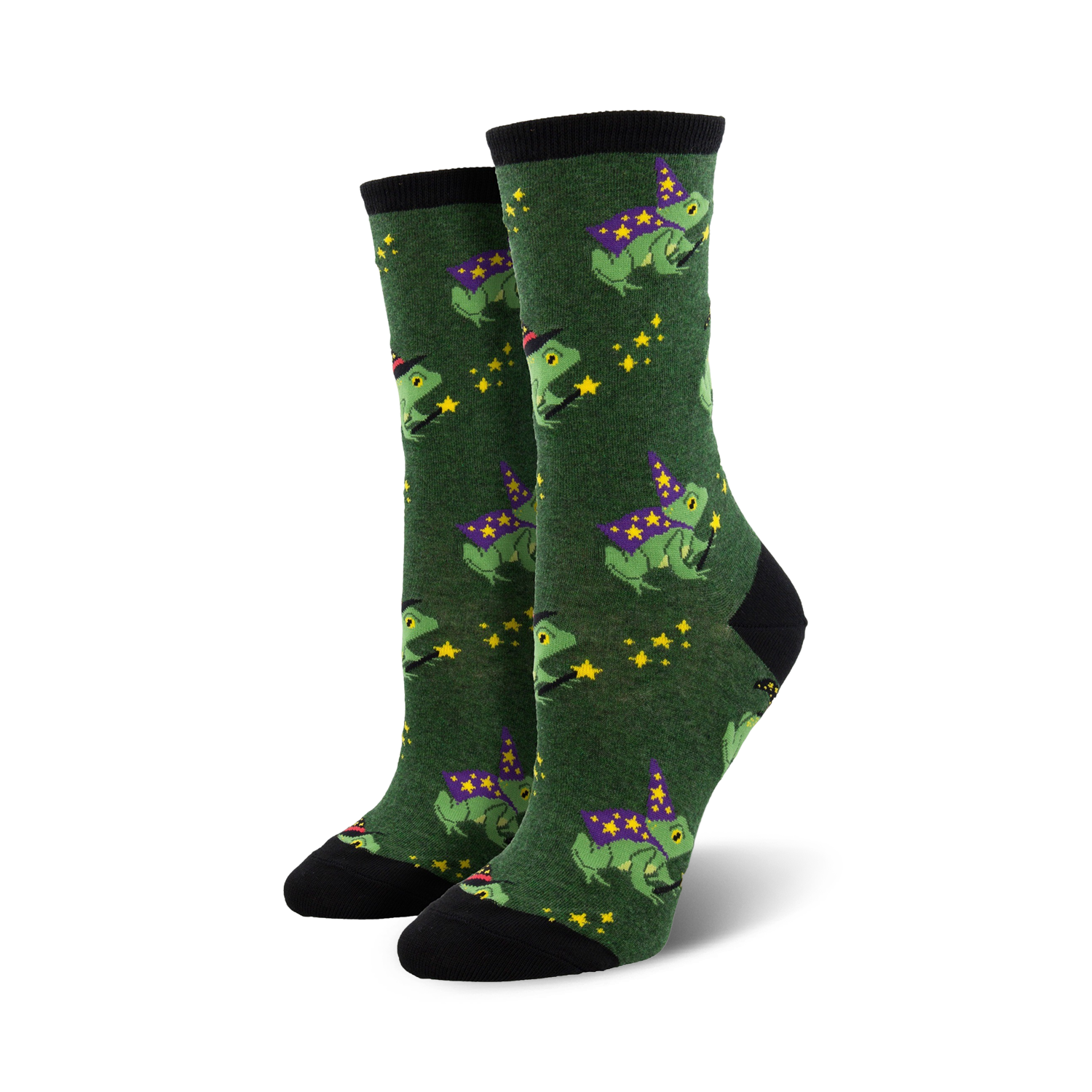 Calling all whimsical adventurers! Experience the ultimate in fun and enchantment as you slip into our spellbinding Freaky Frog crew socks. These charming socks showcase a vibrant array of cartoonish frogs in wizard's hats and magic wands, surrounded by a cosmic dance of yellow stars and crescent moons. Prepare to cast a comfortable spell wherever you go while reveling in the magic of unique sock designs!