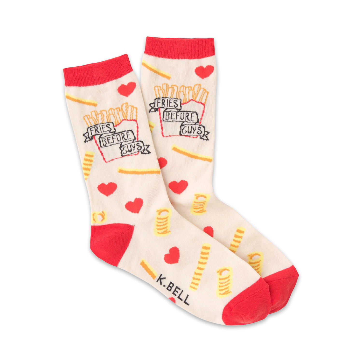 No matter what style you prefer, we all know nothing beats a good portion of golden crispy goodness! These funny socks will let the fellas know your priorities. Each cool pair of off-white and red crew socks features a print of floating hearts and french fries. The phrase "Fries before guys" is above the ankle.
