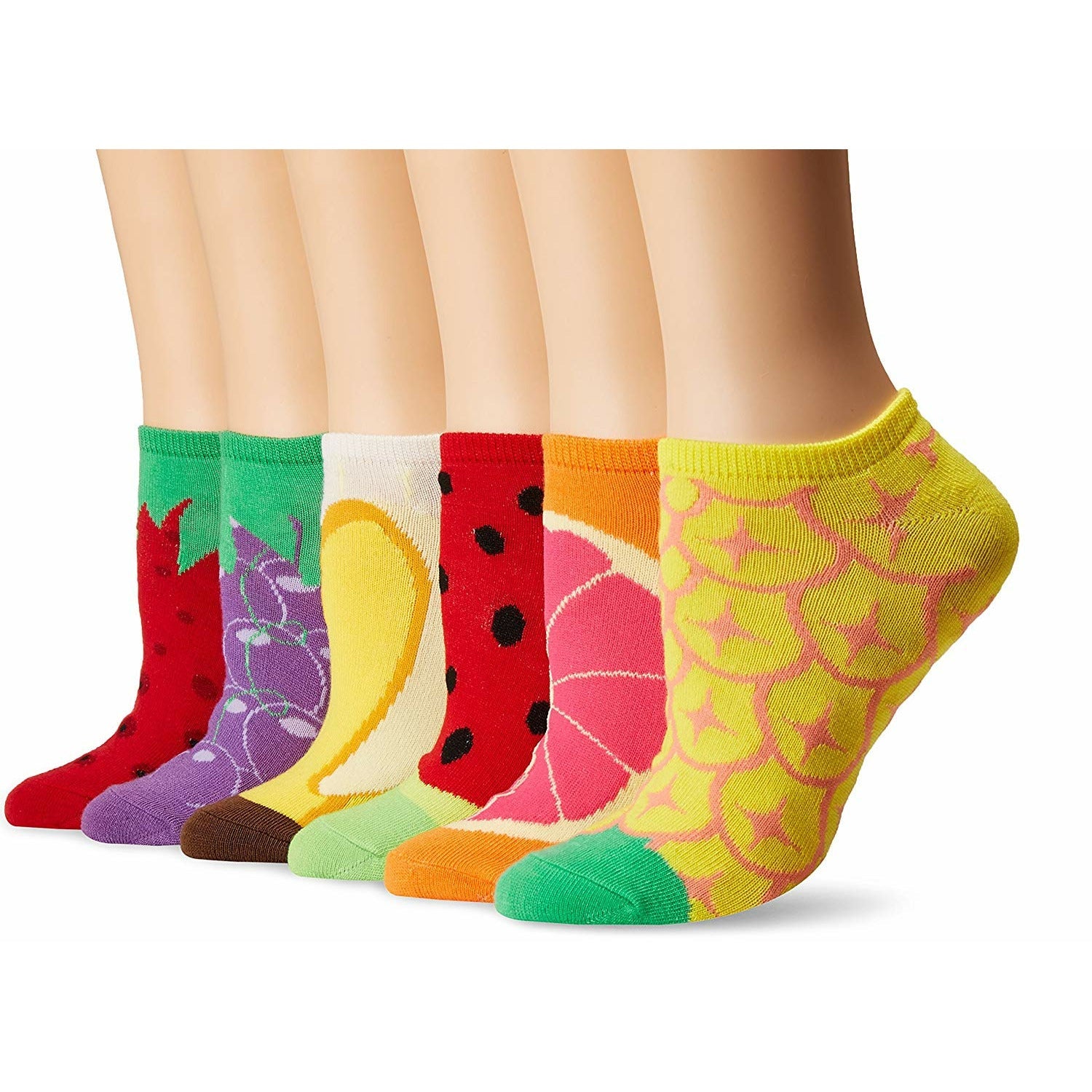 Six pairs of low-cut socks showing different fruits. One sock features strawberries, another shows bunches of grapes. A lemon design is visible on a third pair, while a fourth has a watermelon pattern. There's also a grapefruit sock and a pineapple sock shown in the image. The colors are bright and cheerful- they're perfect for adding a pop of fruitiness to your day. The socks themselves appear to be a fairly standard ankle sock height.