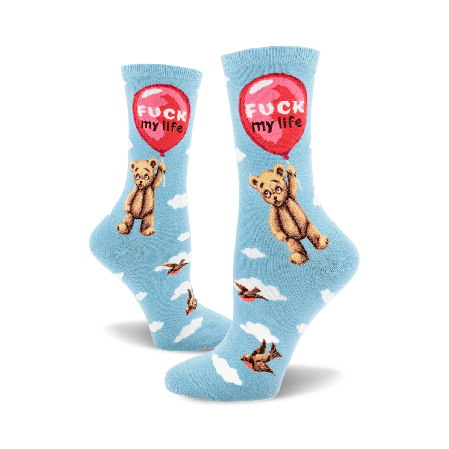 Elevate the humor in your wardrobe with our "Fuck My Life" socks. Canvasing a playful sky of blue, these crew-length charmers sport a whimsical design of white clouds and black birds, crowned by a brown teddy bear clutching a red balloon. Perfect for those days when you need a comical spin on life's little letdowns. Whether it's a quirky gift or a conversation starter at casual gatherings, these socks are sure to bring a smirk. Don't just wear your heart on your sleeve, wear your mood on your feet!