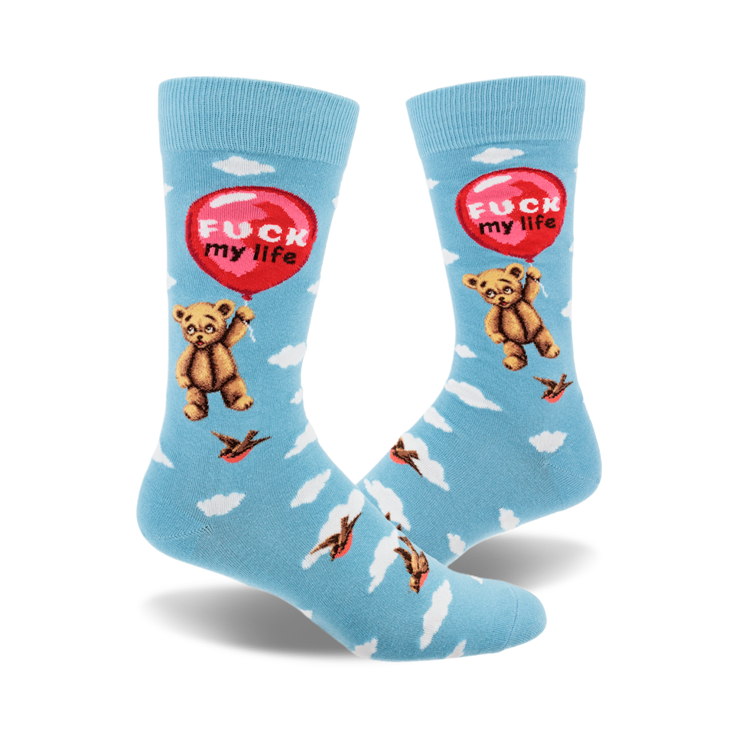 Float away from the mundane with every step! Nestled on these delightfully audacious socks, our bear buddy silently ascends into the azure heavens, hoisted by none other than a vibrant red balloon. But this isn't just any balloon. Emblazoned with a bold "Fuck My Life," it's a whimsical nod to those days when the only way up is literally up. Don a pair, and let your feet do the talking — no explanations necessary, just a sky-high escape with a side of sass.