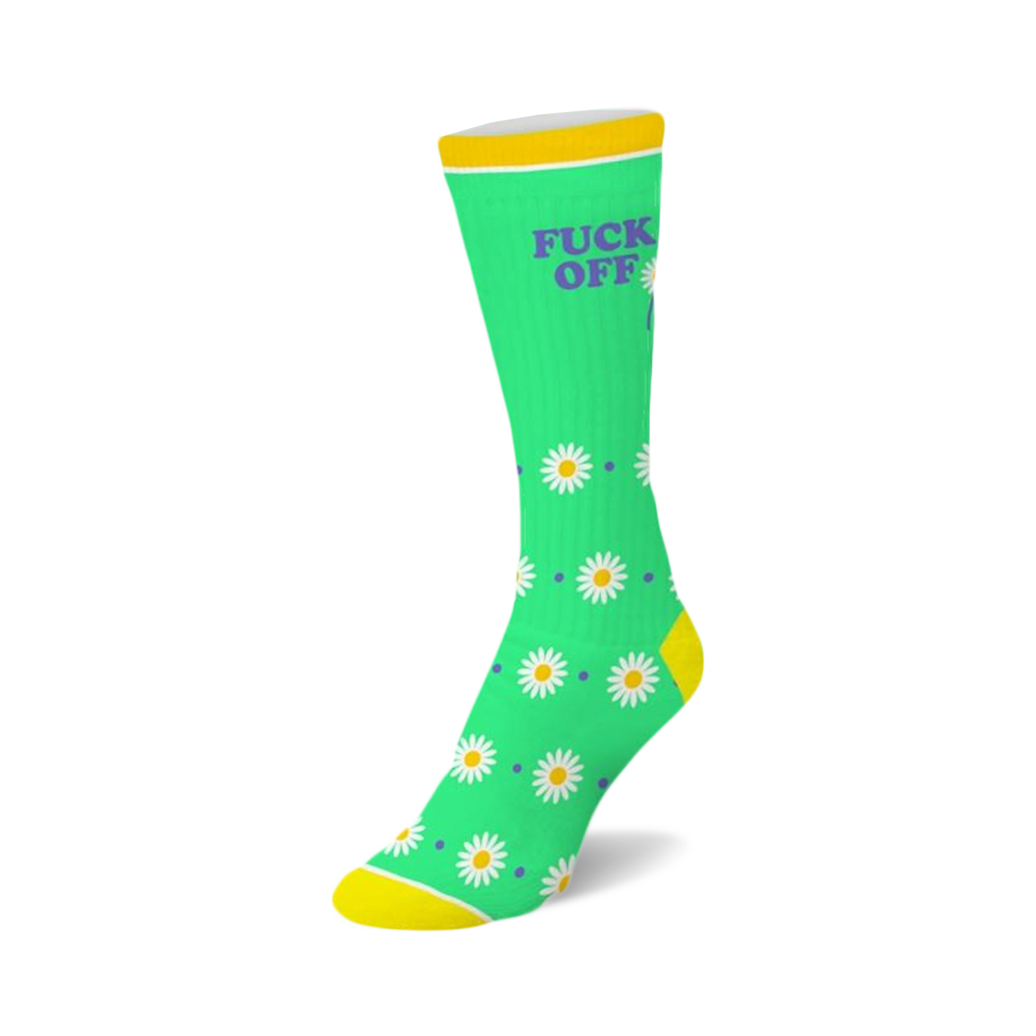Sometimes your feet just need to make a statement. These socks come in a lively green, patterned with white daisies that have bright yellow centers. You'll also spot small purple dots scattered between the flowers. Near the top, below a bold yellow cuff, purple text clearly says 'FUCK OFF'. This design blends a sweet, floral look with a blunt message. The bright yellow color continues on the heel and toe, adding a pop of sunshine to the whole vibe. Great for when you want your socks to do the talking for you.