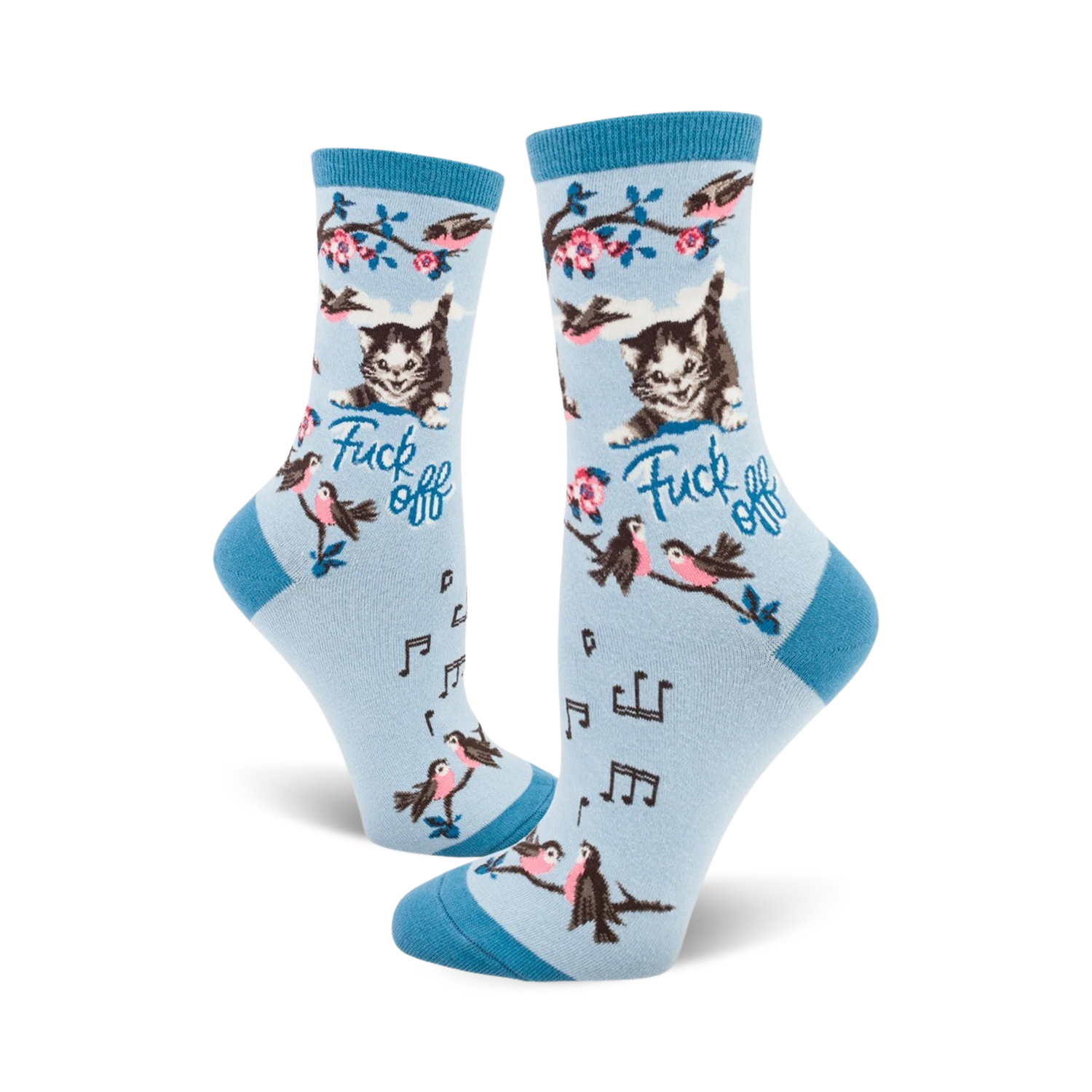 Looking for a pair of socks that will put the "fun" in dysfunctional? Our Fuck Off Kitty Cat Womens Crew Socks have you covered! These pink and blue floral socks feature an adorable, yet sassy cat with its paw raised and the middle finger proudly extended. With birds and musical notes dancing around them, these socks are sure to get a reaction from anyone who sees them. So, next time you feel like flipping the world the bird, slip on a pair of Fuck Off Kitty Cat Socks and let your feet do the talking!