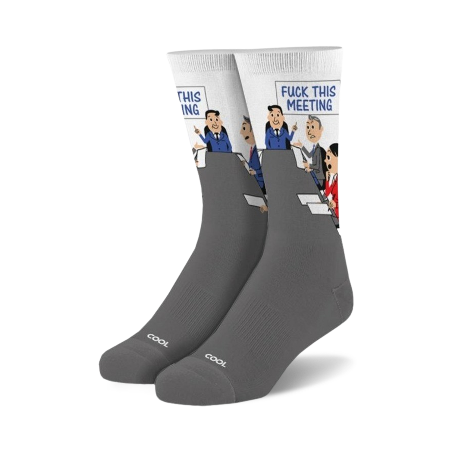 Been to a lot of boring meetings lately, but afraid to say anything? Take a stand and scream from the soles of your feet with our "Fuck This Meeting" gray crew socks. They'll show everyone exactly how you feel. Plus, who knows, maybe your boss will get the hint and start making meetings more interesting.