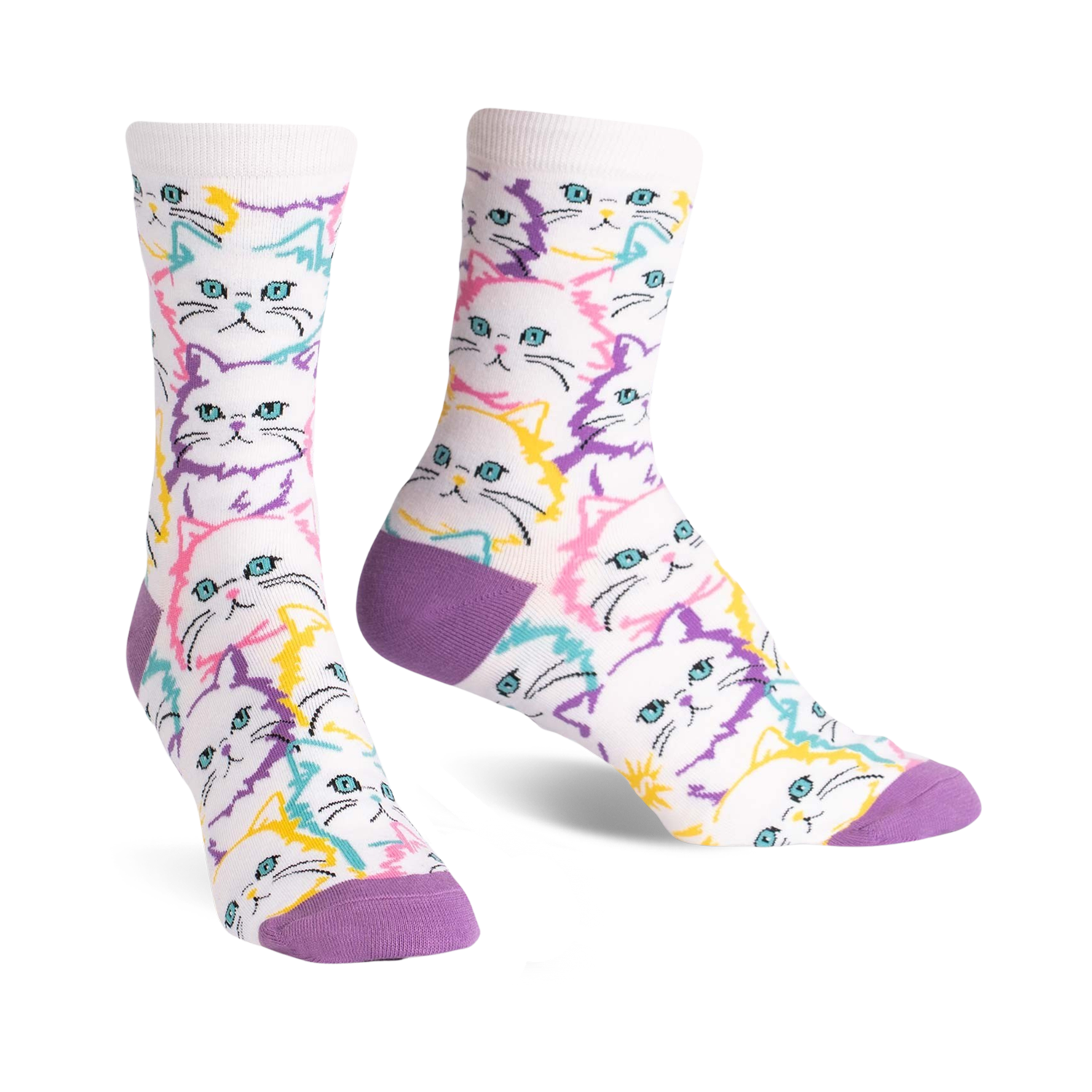 Meet Fur Real: the lively crew socks featuring a playful parade of cartoon cat faces. Unleash your inner feline with these vibrant socks that'll turn your feet into a purr-fect fashion statement. Strut your stuff and let your toes do the talking, because everyone knows cats rule the internet - and now they can rule your sock drawer too!