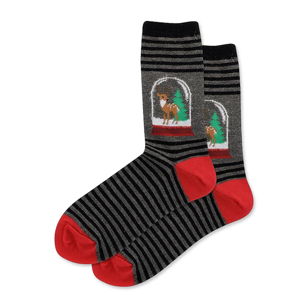 These socks feature a cool dark grey base with thin black horizontal stripes running down most of the foot and leg. A solid black band at the very top provides a neat finish. The heels and toes pop with a bright, solid red color. Up top, on the leg of each sock, you'll see a charming snowglobe design. Inside, a brown reindeer with visible antlers stands on a white base next to a green Christmas tree. The snowglobe itself has a clear white outline and a red bottom. They're a cozy way to add some holiday fun to your everyday outfits.