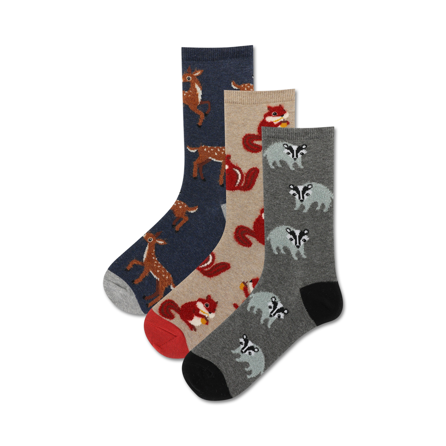 Fuzzy Woodland Animal 3 Pack Socks: These socks are just wild about woodland creatures! Three patterns of deer, raccoons and badgers, oh my! in blue, brown, and gray feature these cuties in a cozy crew sock. Cozy up with these woodland friends and explore the great indoors (or outdoors) in style. Available in women's sizes, these socks are perfect for anyone who loves animals, nature or just plain cozy socks.