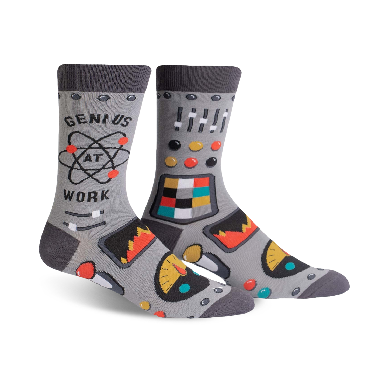 Kick your feet into gear with the hilarious 'Genius at Work' socks, designed for the mechanical masterminds! These socks in gray boast a playful pattern of gears, cogs, and various mechanical elements. Gear up for grins with the 'Genius at Work' proclamation displayed on the left sock. Bust out these crew-length socks to inspire creativity and fuel your inner brilliance!