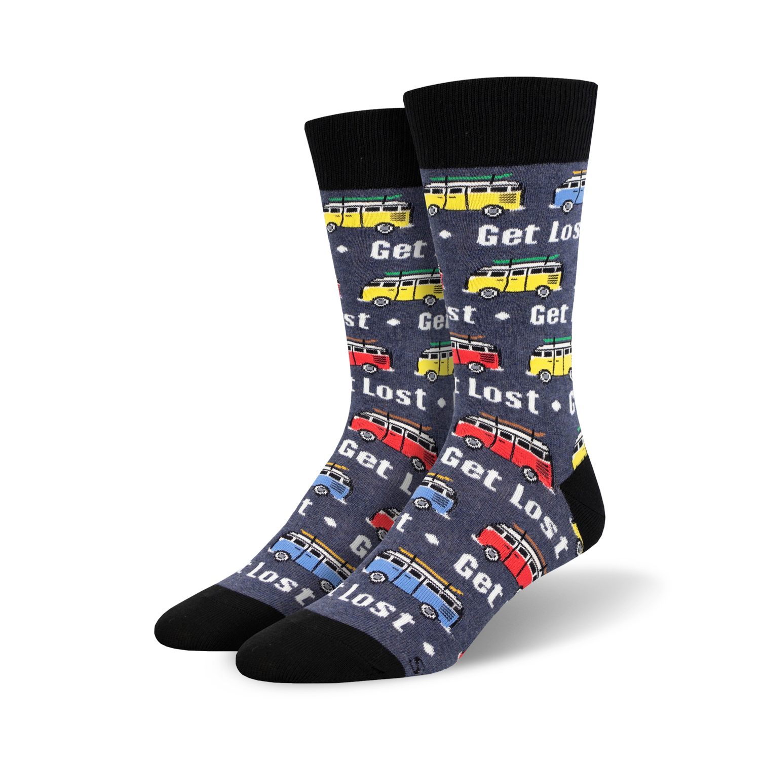 Get Lost: Crew socks with a rad pattern of multicolored camper vans and the words 'get lost' taking you on a groovy adventure with every step. Whether you're hitting the road or just dreaming of the open highway, these socks will have you feeling far out, brother.