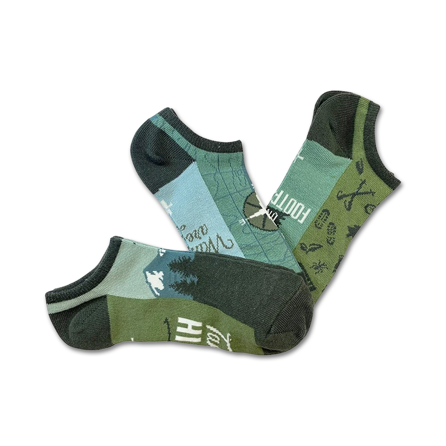 Socks include the qutoes "Not All Who Wander are Lost"; Take a HIKE" and "Leave Only Footprints