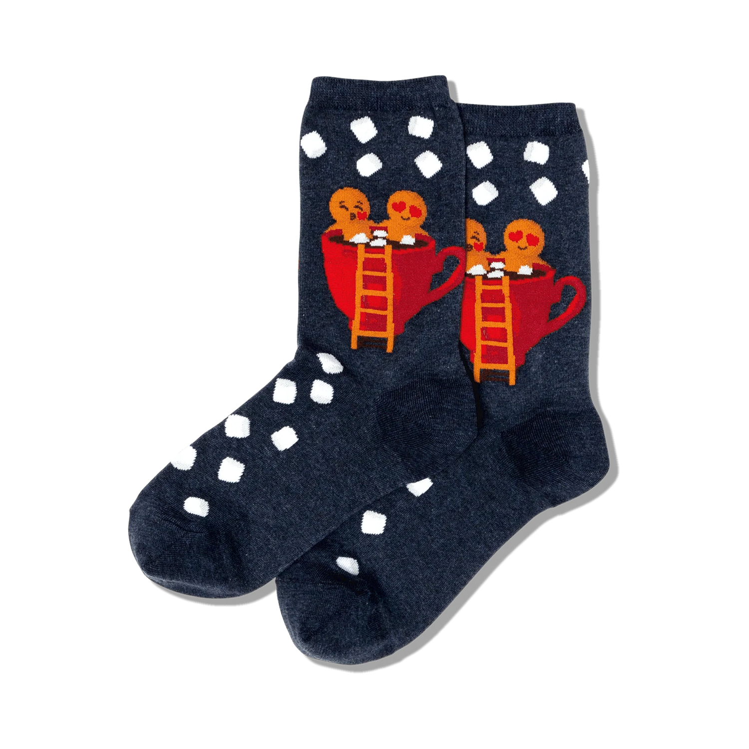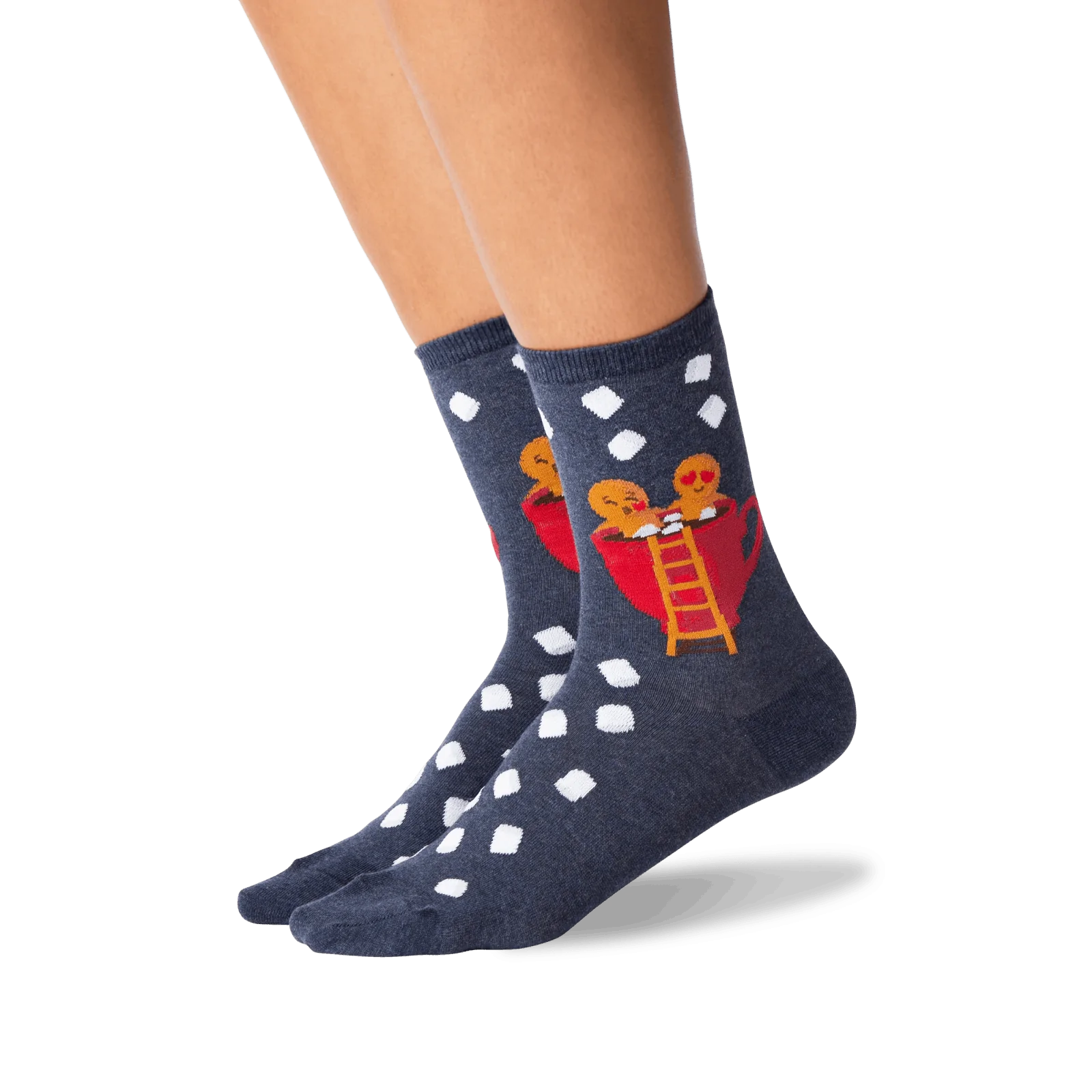 Meet the Gingerbread Couple Crew Socks: A sweet, festive pair that's perfect for the holiday season. These dark blue socks with white polka dots feature a gingerbread man and woman standing in a red coffee cup with a ladder beside them. They'll be a fun and unique gift, even if you give them to yourself!