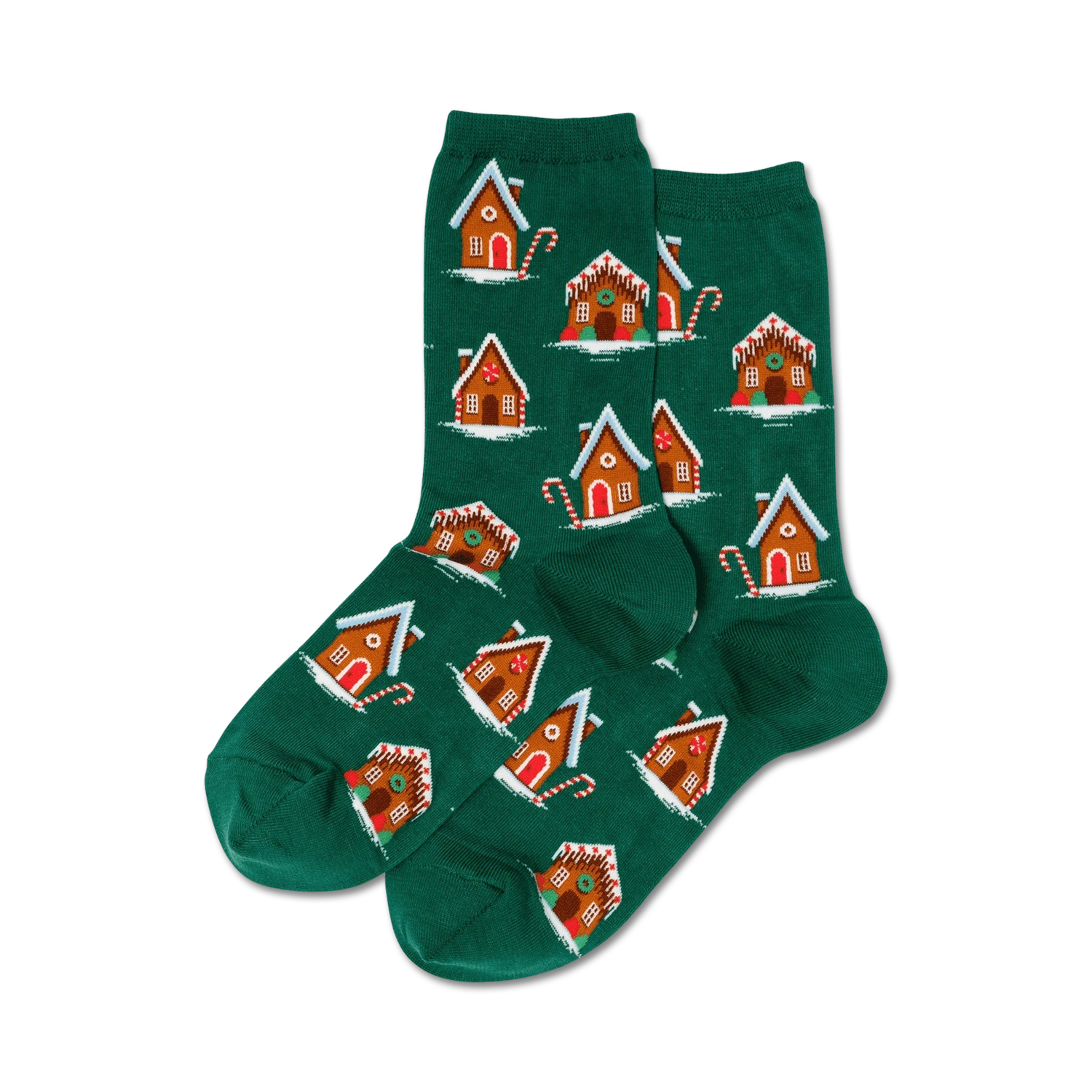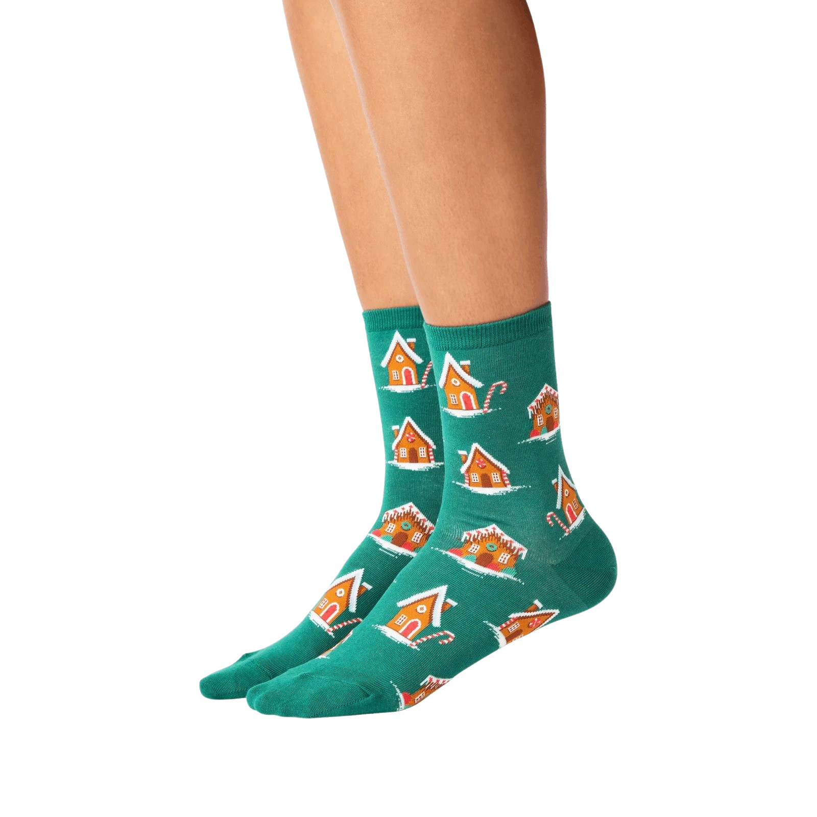 Gingerbread Houses - Holiday Cheer at Your Feet!: What do you get when you cross a pile of freshly fallen snow and a plate of gingerbread cookies? The Gingerbread Houses crew socks! Slip into a pair of these cheerful socks to brighten up even the most chilly of days. You'll feel like you're strolling through a winter wonderland with gingerbread houses lining the streets and candy canes growing on trees. Plus, who says only Santa can wear green and red on Christmas? These socks will add a fun twist to any holiday outfit. Spread a little cheer wherever you go with these festive gingerbread-themed crew socks.