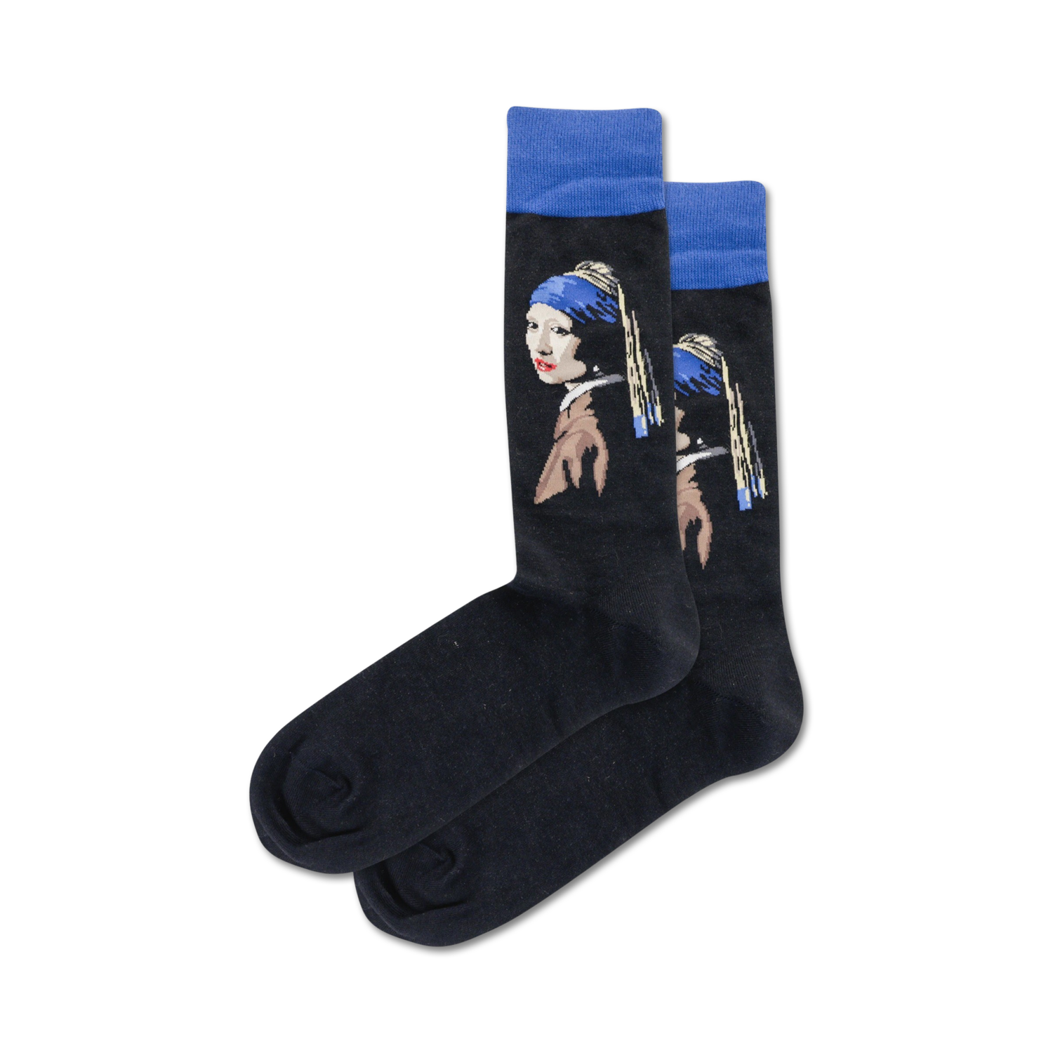 These Girl with a Pearl Earring socks are a work of art! With their classic black background and stunning depiction of Vermeer's masterpiece, they'll elevate your sock game to new heights. The intricate details, from the girl's enigmatic smile to the shimmering pearl, will have you feeling like a true connoisseur every time you slip them on. Trust us, these socks are so much more than just a fashion statement - they're a conversation starter, a history lesson, and an expression of your inner Rembrandt, all rolled into one. And who knows, they might even inspire you to create your own masterpiece!