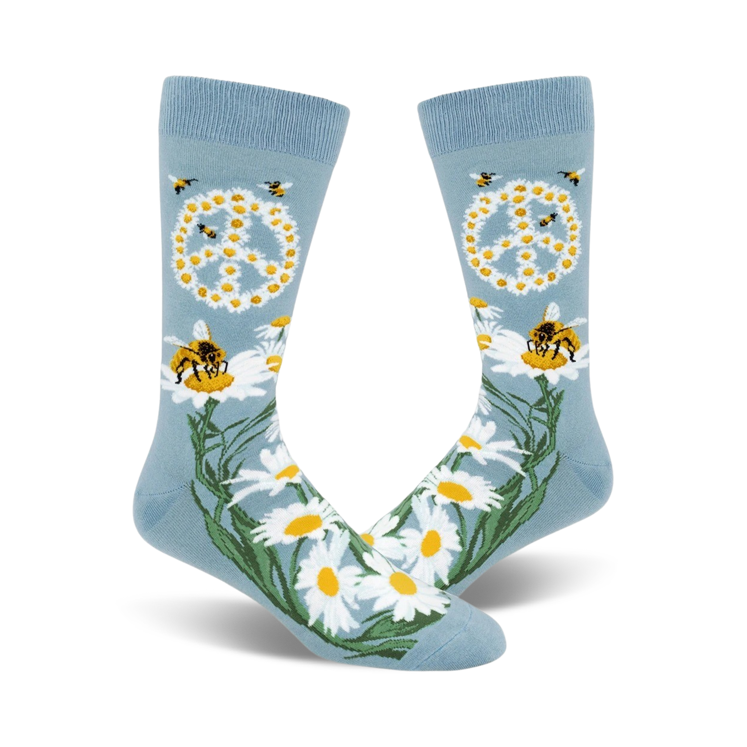 Buzz buzz! Put on a pair of Give Bees A Chance socks and let the bees take you on a summery adventure. Featuring buzzing bees, blooming flowers, and peaceful flower-shaped peace signs, these crew socks for men are sure to make you smile and spread some much-needed positivity. Whether you're tending to your garden, advocating for the environment, or just enjoying a day in the sun, these socks are the perfect way to show your love for nature and add some fun to your everyday style.