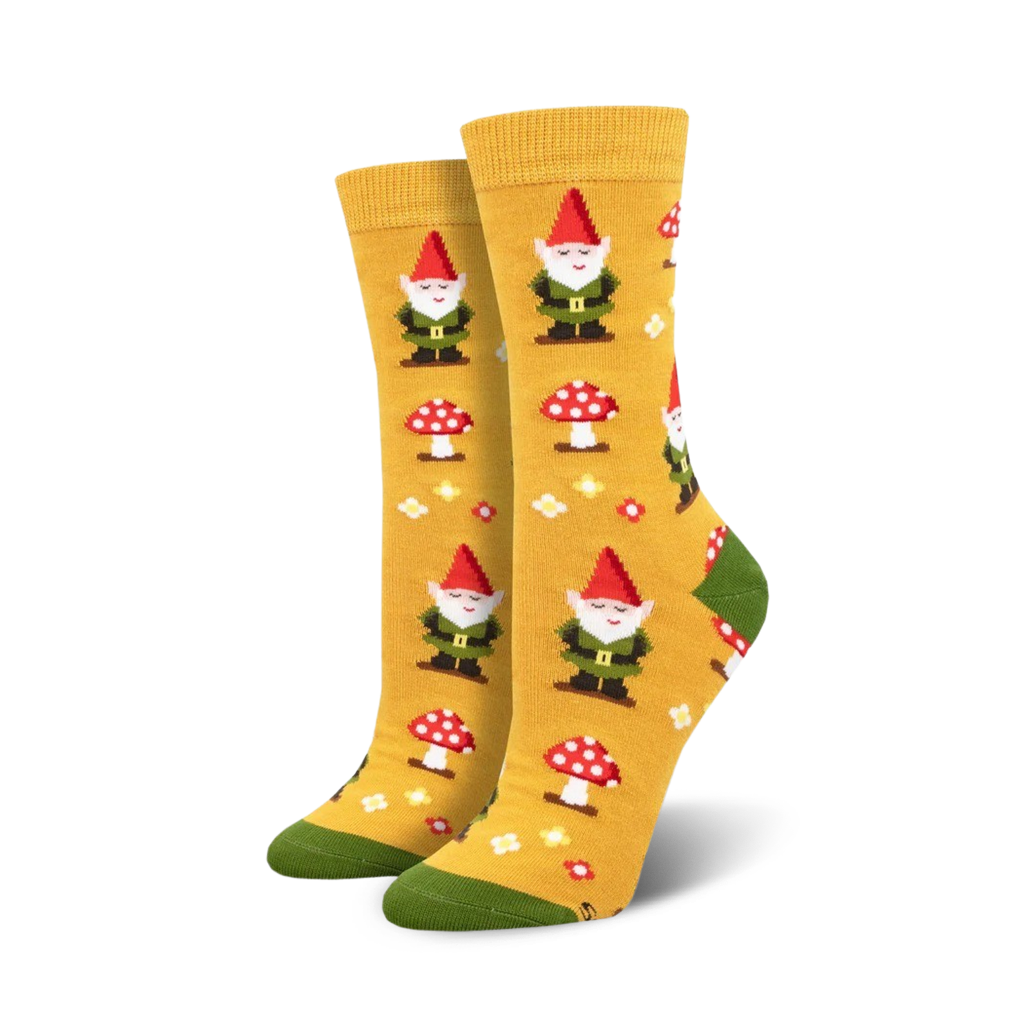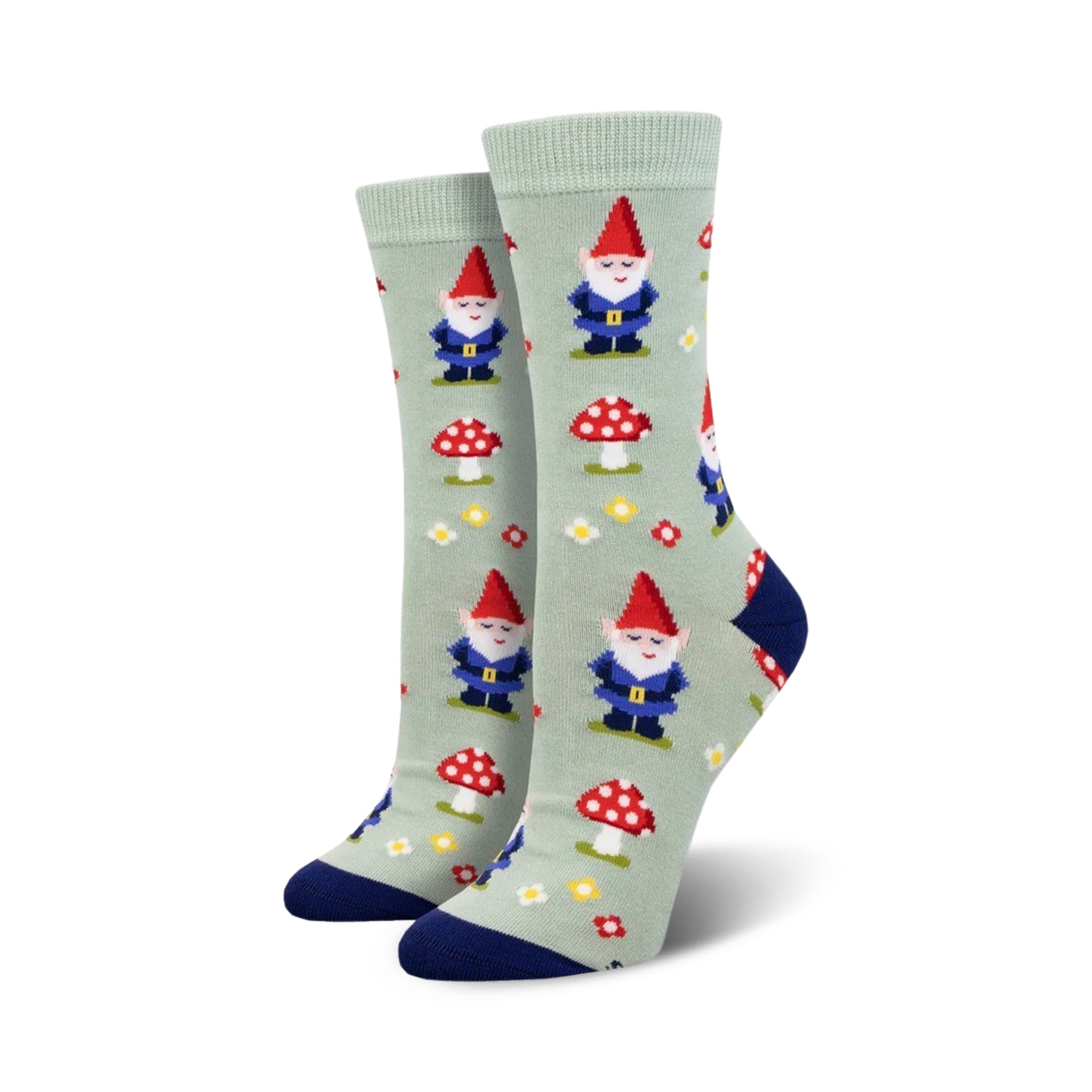 Gnome More Mushrooms Women's Crew Socks bring a smile to your face and brighten anyone's day with vibrant red toadstools and blue and white floral patterns dancing around smiling gnomes. Just like Mario Bros. gnomes love mushrooms, and these socks are packed with mushroom and gnome fun. The secret to life is to always stay grounded like a gnome.