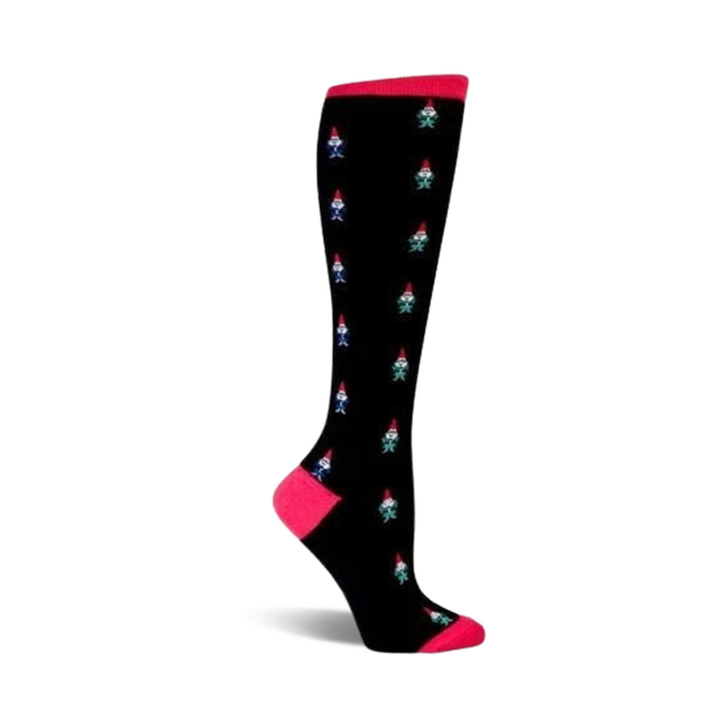 To gnome me is to love me. These fun knee high socks won't sell you short, gnome pun intended! Each cool pair of all black socks features a pattern of tiny gnomes in a few different colored outfits with hot pink detailing at the band, heel, and toe.