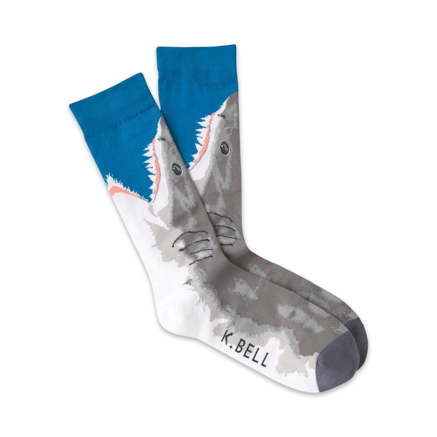 Unleash your inner shark with these striking shark socks! Crafted in a crisp white hue, they showcase a mesmerizing pattern of great white sharks, their grey bodies accented by white bellies and ferociously open mouths revealing razor-sharp teeth. Blue toes and cuffs add a splash of playful color, ensuring you make waves wherever you go!