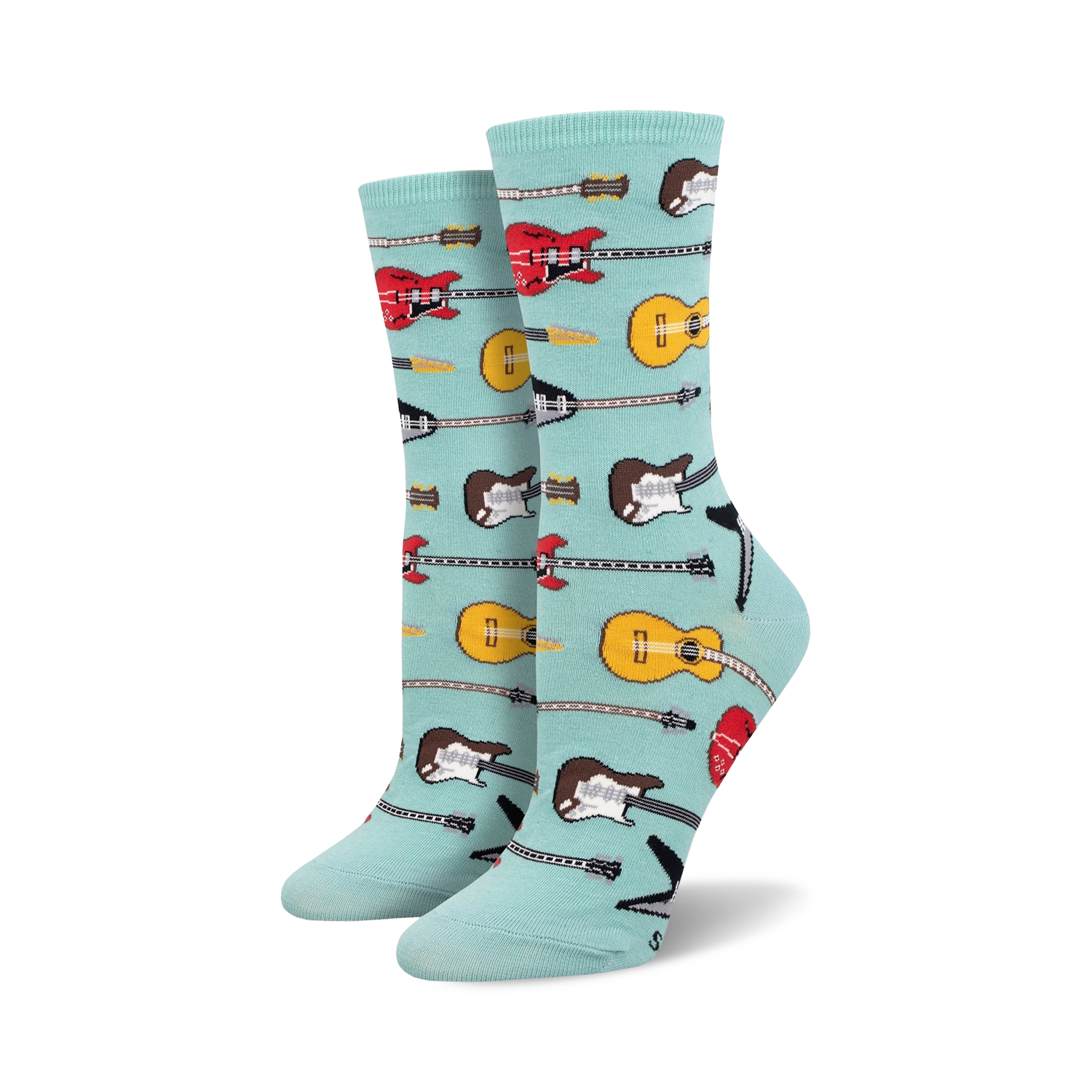 Unleash your inner rockstar with our Guitar Riff socks, featuring a harmonious blend of red, yellow, and brown guitars strumming across a light blue background. Whether you're a shredder on stage or just rocking out in your living room, these socks will keep your feet groovin' and spread guitar vibes wherever you go!