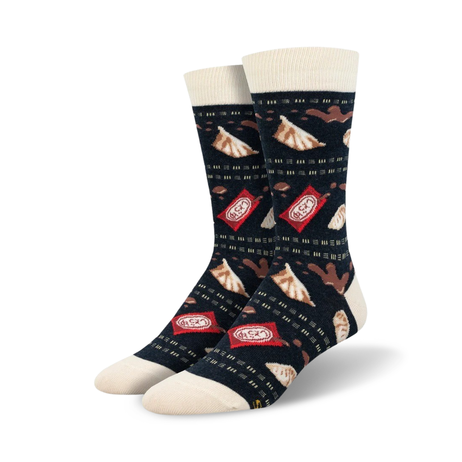 Gyoza, gyoza, how do you pleat? A question only these fun socks can answer. Go on, show these dumplings just how much you love them by wrapping your feet in their scrumptiousness. Available in a crew length with a black base and an all-over print of everyone's favorite Japanese treat.