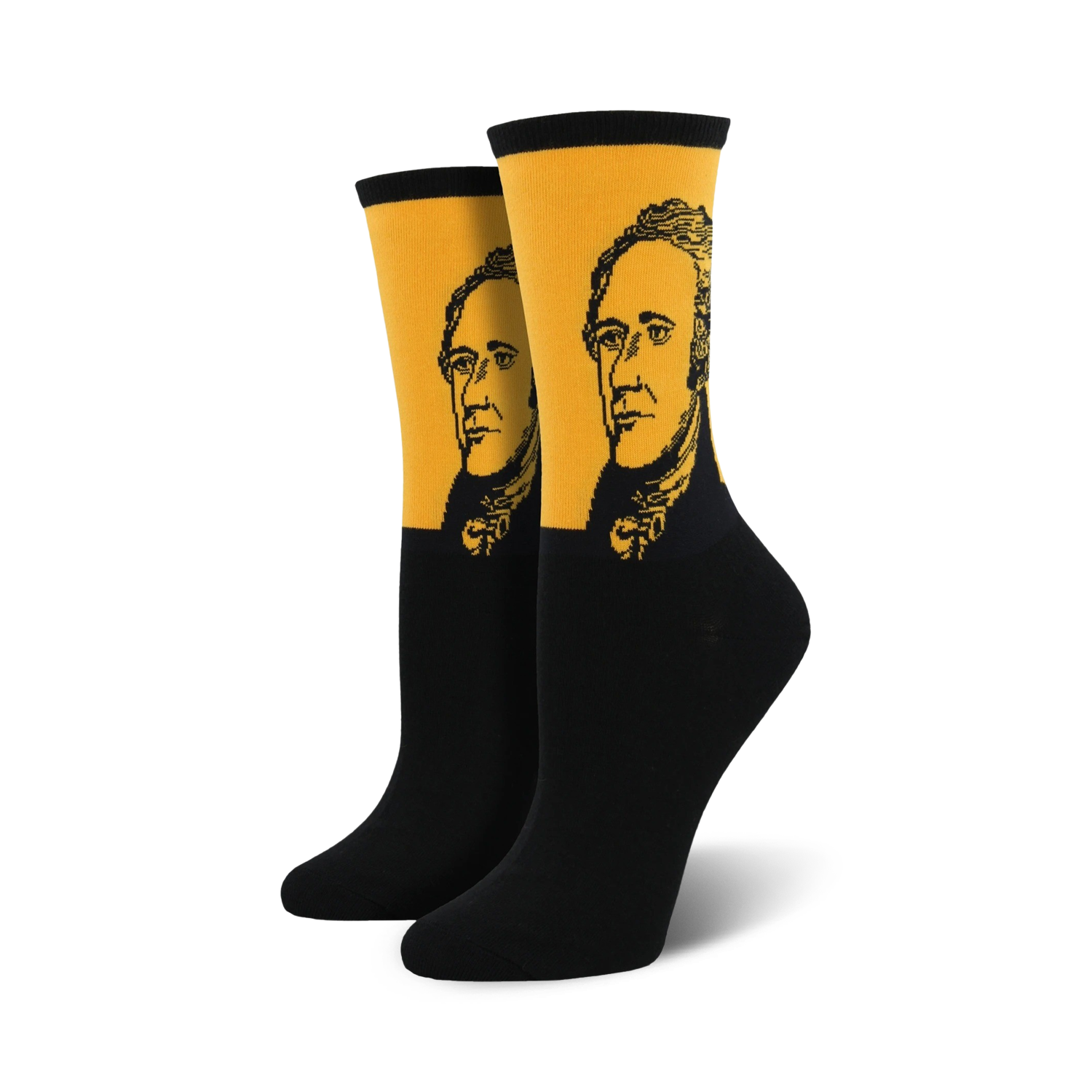 You say "Hamilton," we say socks! That's right, these socks, like the great man himself, are a force to be reckoned with. In a stunning black and gold, adorned with a portrait of Alexander Hamilton, these women's crew socks are perfect for any fan of the Broadway hit. Wear them to your next history lesson, or just to show your love for the Founding Fathers. Fun fact: Hamilton was known for his sharp wit and eloquent speeches. Just like these socks are known for their sharp style and ability to get people talking.