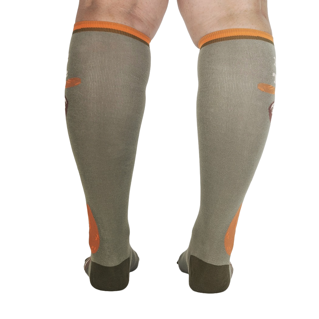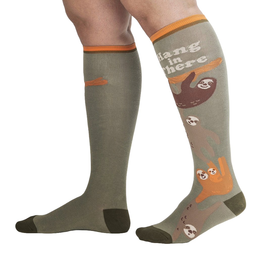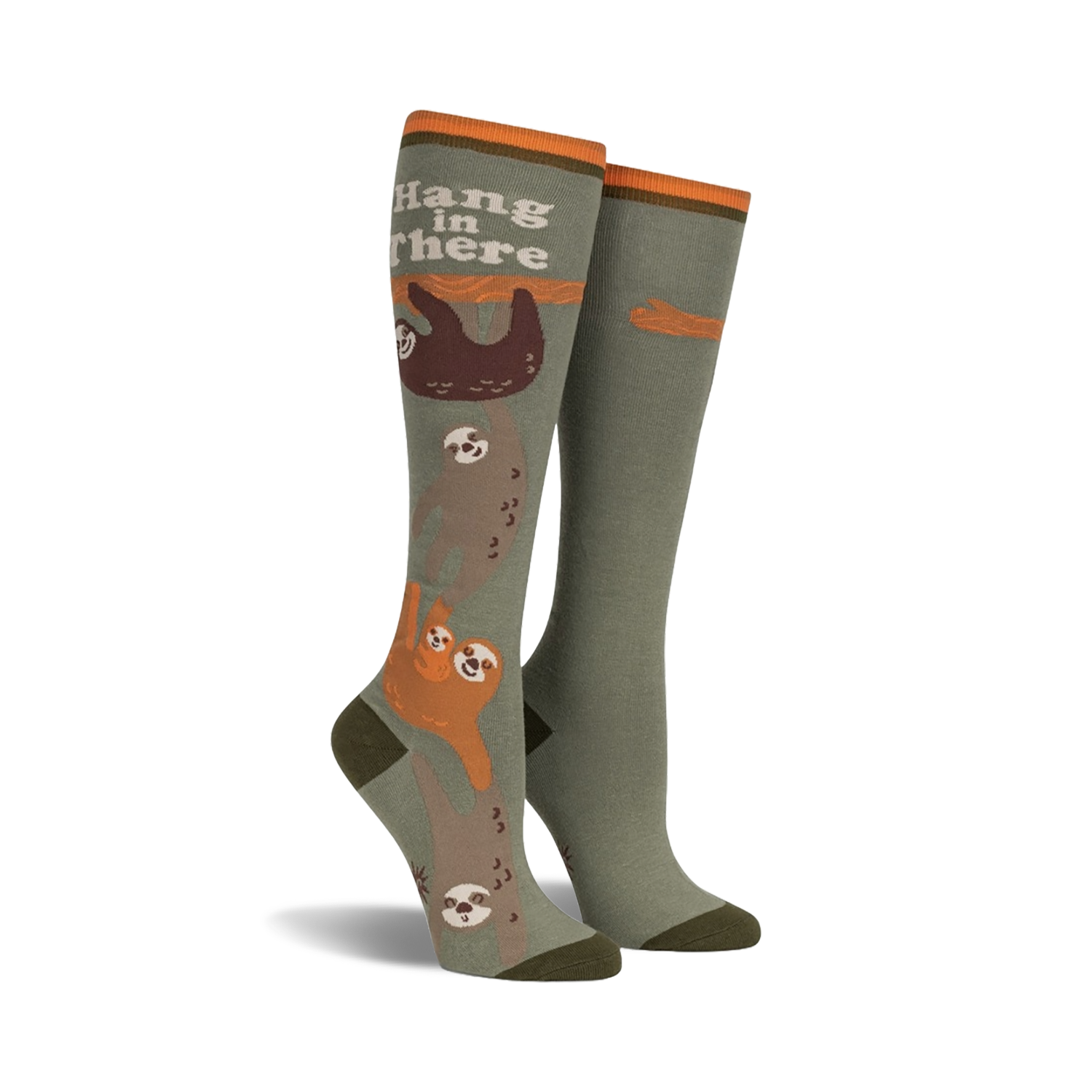 Hang in there! These knee-high socks for women feature three cartoon sloths hanging from a branch. With the words "Hang in There" written on the top cuff in white, these green socks with brown and orange accents are a fun and lighthearted way to remind yourself to keep going.