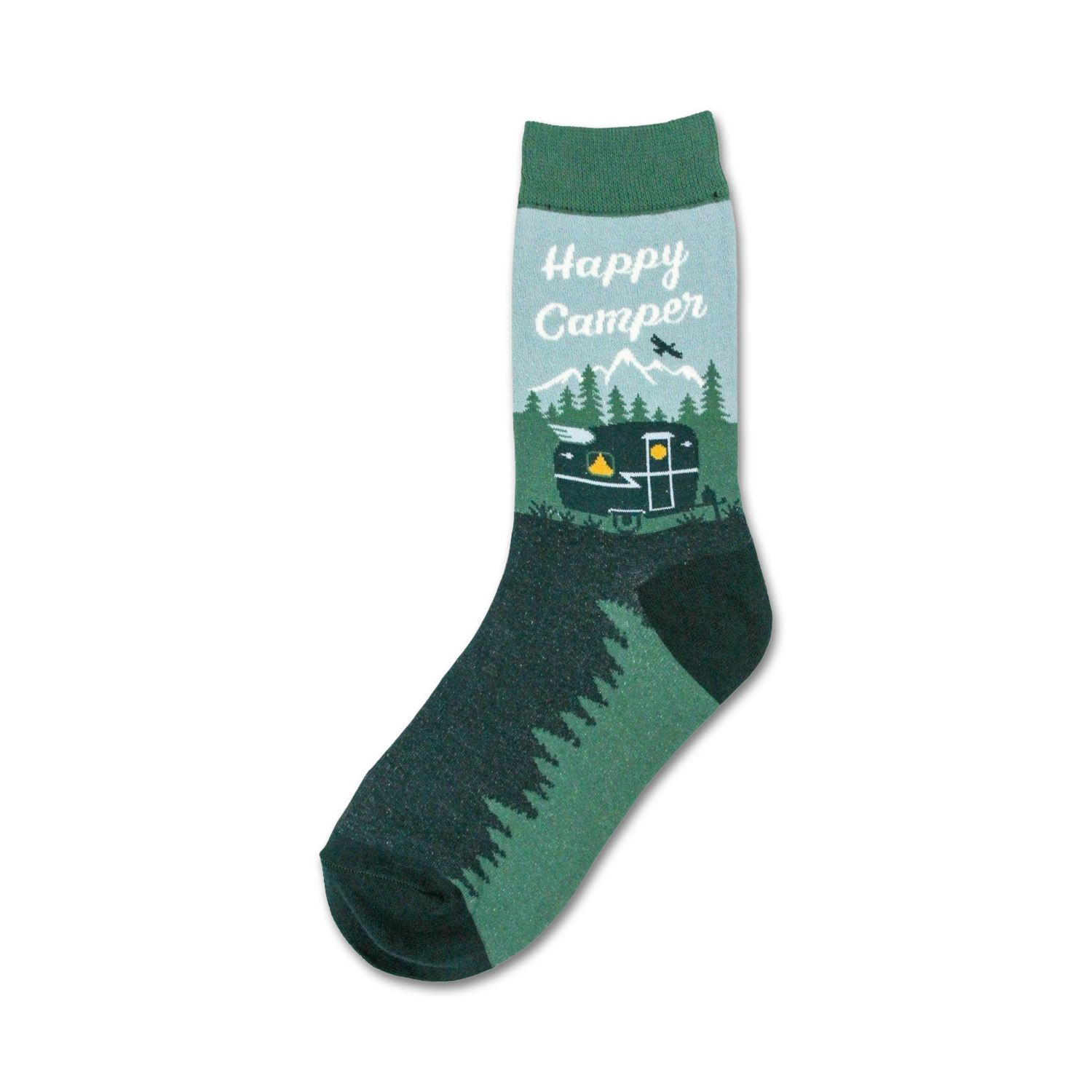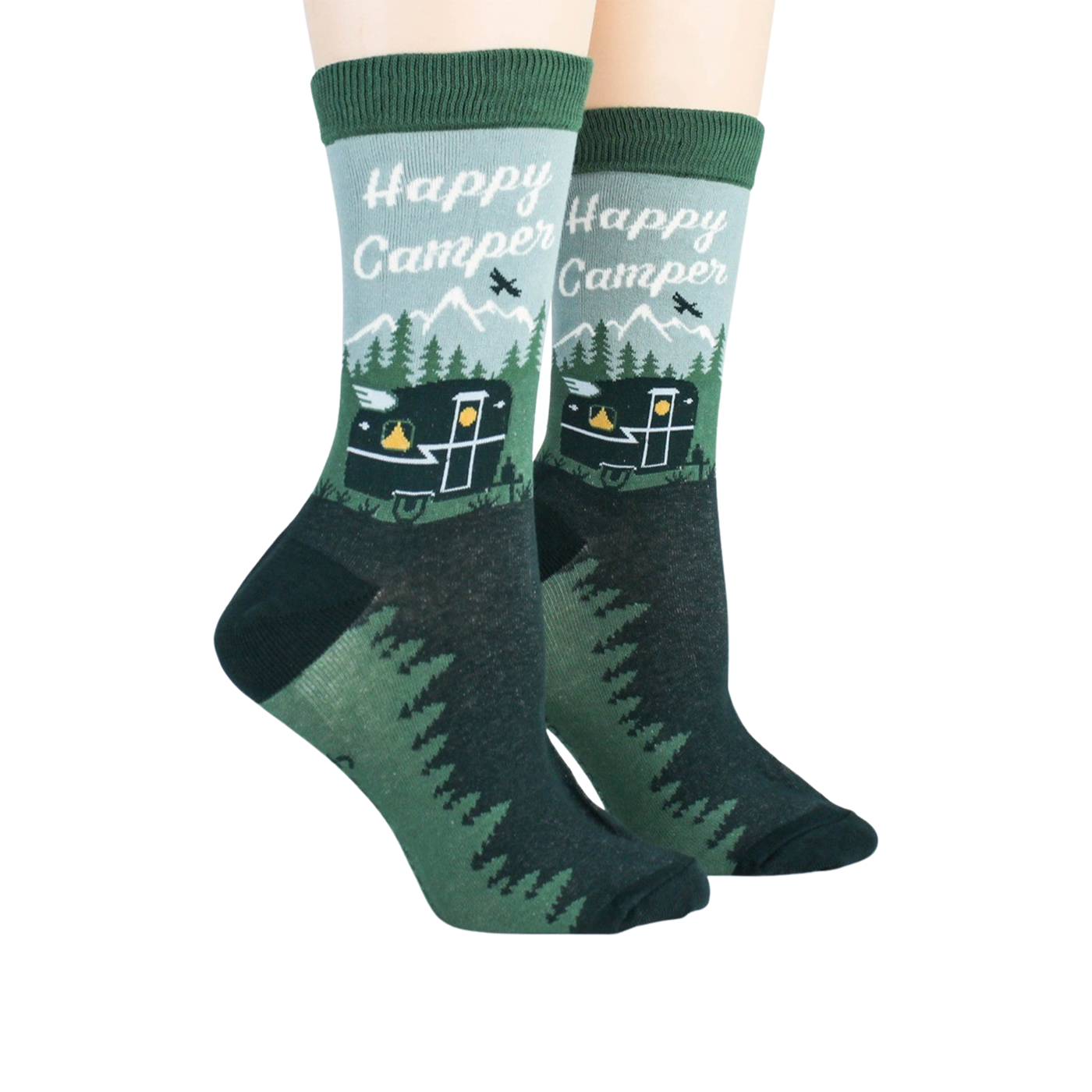 Happy Camper Collection: Designed for the outdoor enthusiast, these crew socks feature a playful scene of a cozy campervan cruising through green pine trees with mountains and a sun shining brightly above. Perfect for camping trips, hiking adventures, or adding a touch of fun to everyday wear, these socks are a great reminder to seek joy in the simple moments of life.