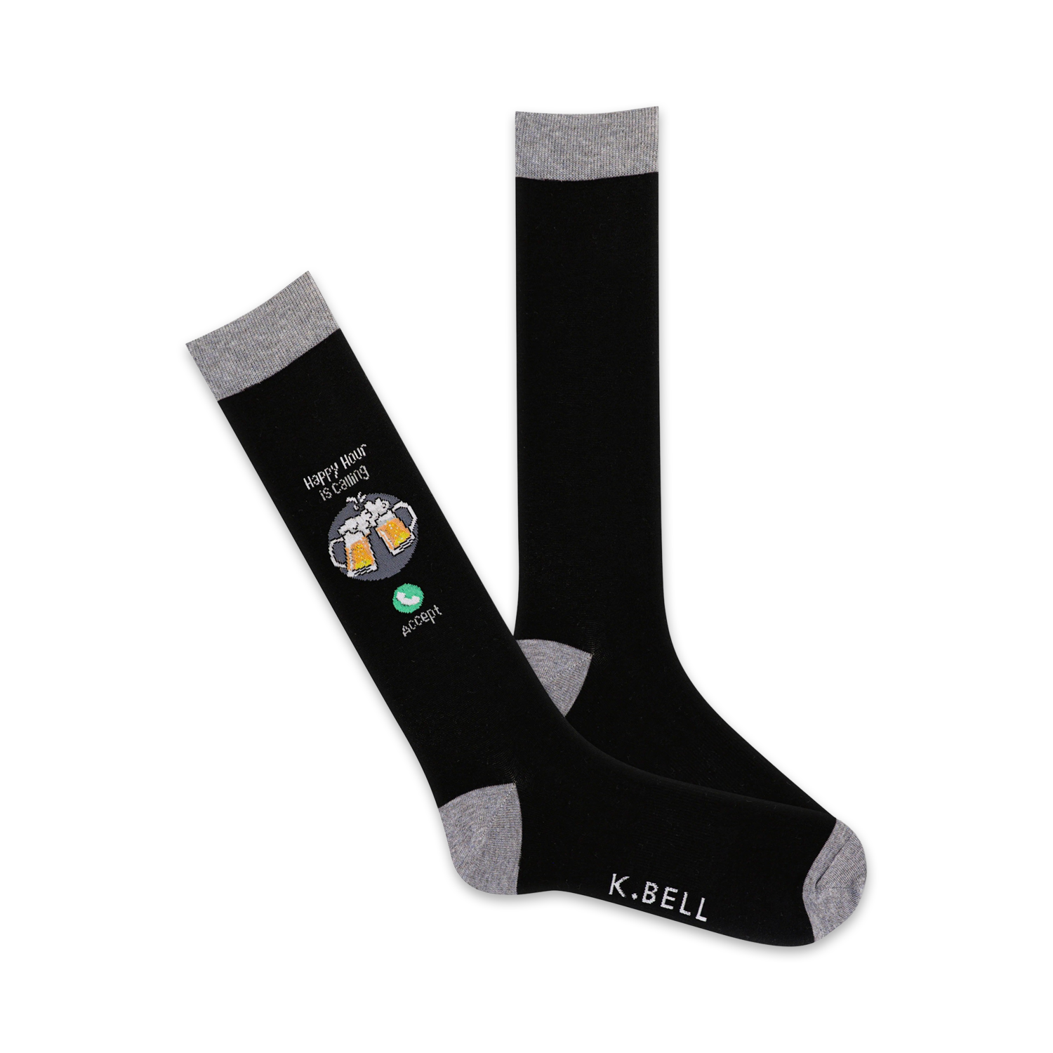 Slip on a pair of these "Happy Hour is Calling" socks and let the good times brew! These black crew socks feature gray toes, heels, and tops with two beer mugs and a phone, reminding you that it's always 5 o'clock somewhere. Perfect for the beer lover in your life.