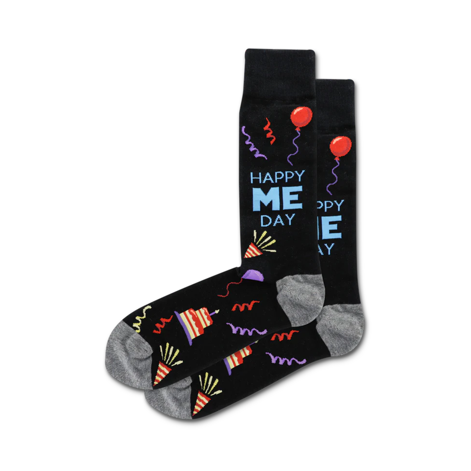 Birthday sock game like no other! Slip your feet into these marvelous "Happy Me Day" mens crew socks and blow your own mind. Wake up and put on a smile cause' it's another "Happy Me Day". Turn an ordinary day into a party with these black socks covered in colorful balloons and streamers. Bust a move in socks that are as rad as you are to have a "Happy Me Day" everyday. Can we get a "Happy Me Dance" if you like them?