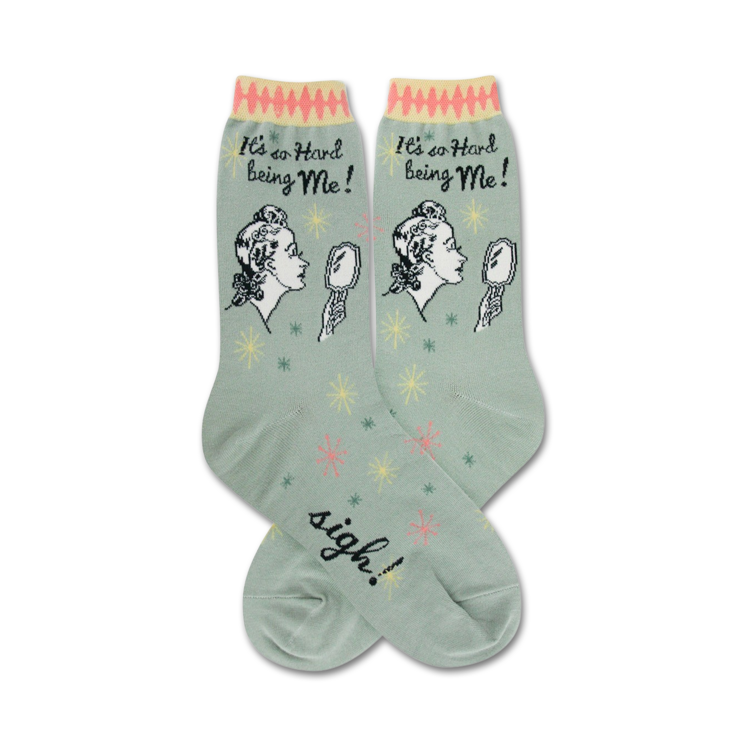 Anyone who's ever found themselves mirroring a melodramatic sigh can now wear their heart on their sleeve or rather, their sass on their feet. These vibrant green "Hard Being Me" crew socks sport a charming illustration of a woman eye-rolling at her reflection. Adorned with the words "It's So Hard Being Me!" these socks are perfect for days when you're feeling playfully dramatic or need that extra bit of flair for your ensemble. Hosting a girls' night in or strutting into a casual Friday? Let these socks tell the world exactly how tough (or how fun) being you can be! Why not grab a pair today and flaunt your beautiful burdensome self?