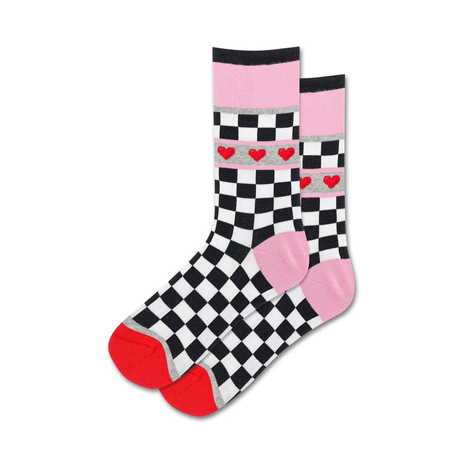 Meet 'Heart Check', the new sock that makes you feel loved and stylish! These whimsical socks feature a classic black and white check pattern with a splash of pink. Their vibrant pink toe and cuff are sure to bring a smile to your face and everyone around you. And with three red hearts embroidered on each sock, you'll be spreading love wherever you go.