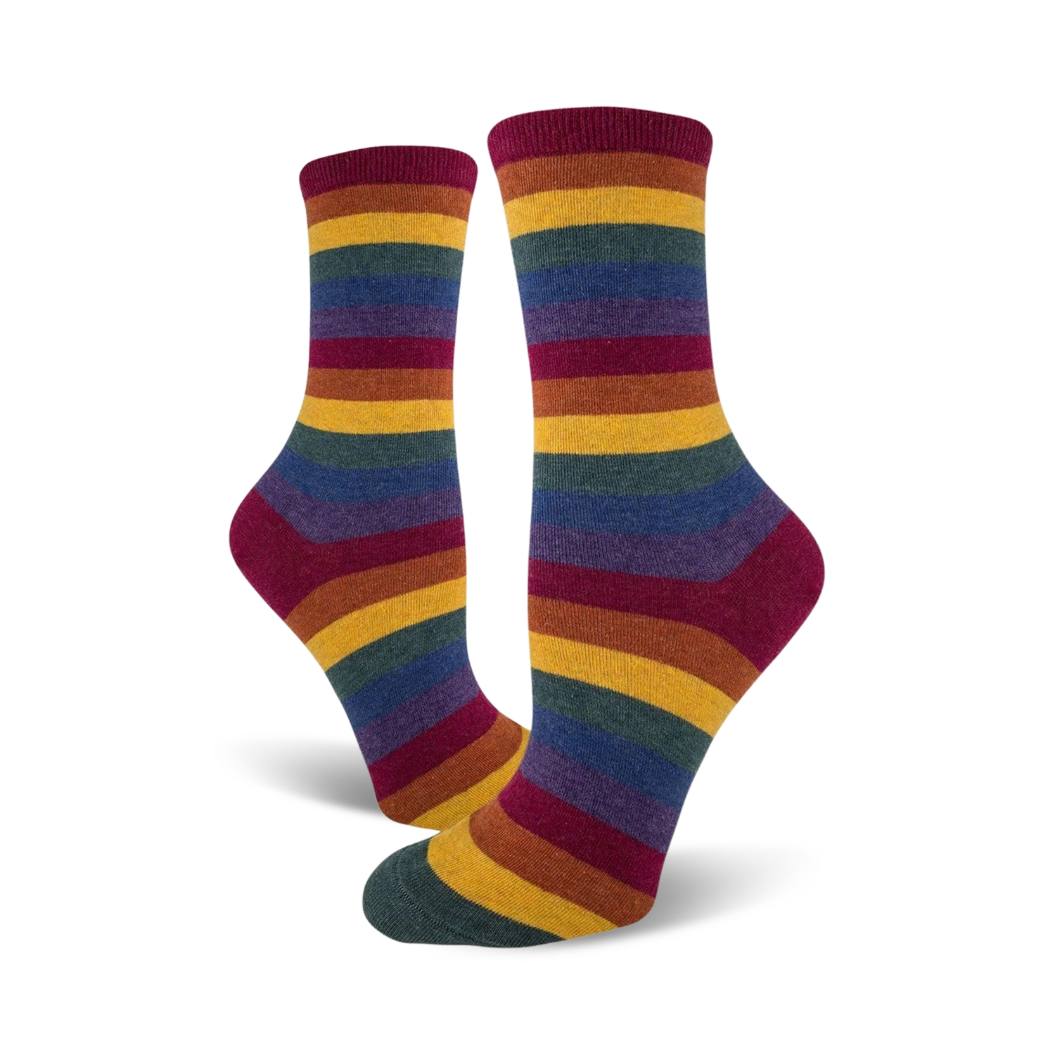 Behold the Heather Rainbow Striped Crew Socks, a vibrant symphony of color that makes a striking statement with every step. These socks strut their stuff in a parade of horizontal stripes, boasting hues of burgundy, red, orange, yellow, green, blue, and purple, reflecting pride and diversity. Get ready to let your feet vogue!
