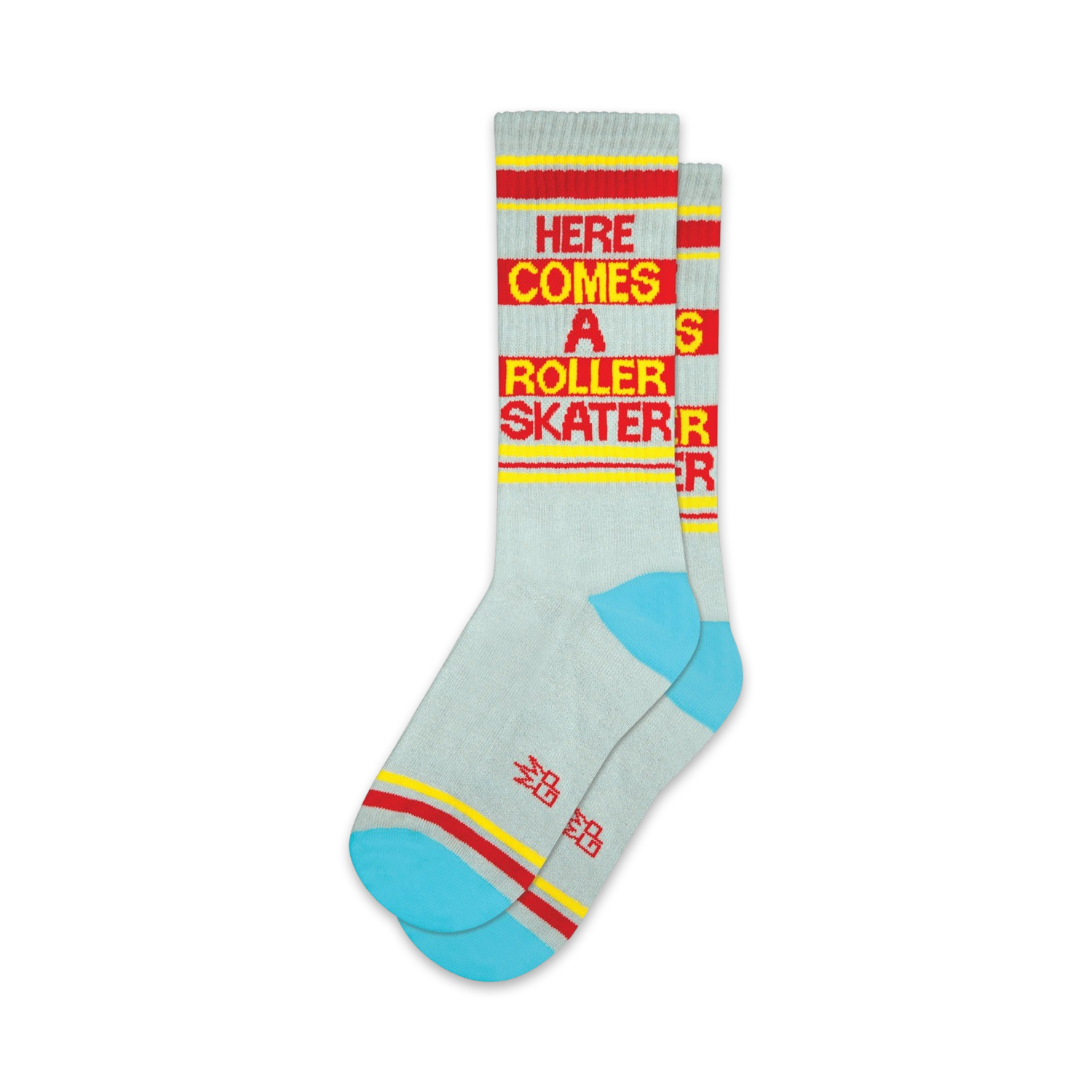 Get ready to roll into style with our Here Comes A Roller Skater Gym socks! These light gray crew beauties will have you gliding through the day with their blue toes and heels that'll make you feel like you're living on cloud 9. Plus, the bold red and yellow lettering on the front spells out "Here Comes A Roller Skater," so everyone can catch your moves. So, grab a pair and lace up your skates, because fashion and fun are about to take a wild ride!